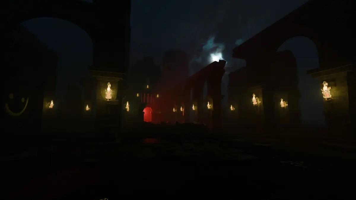 The image shows a dark, cavernous room with rough-hewn stone walls lit by a single red lantern hanging from the ceiling. The lantern casts an eerie glow on the dusty floor and the shadowy alcoves that line the walls. In the foreground, a cloaked figure stands with their back to the viewer, their face obscured by the hood. Their staff rests against the wall beside them, its tip glowing faintly with an otherworldly light.The image is full of suspense and mystery. The viewer is left to wonder who the figure is and what they are doing in this dark and foreboding place. The red light from the lantern adds to the atmosphere, creating a sense of danger and unease.