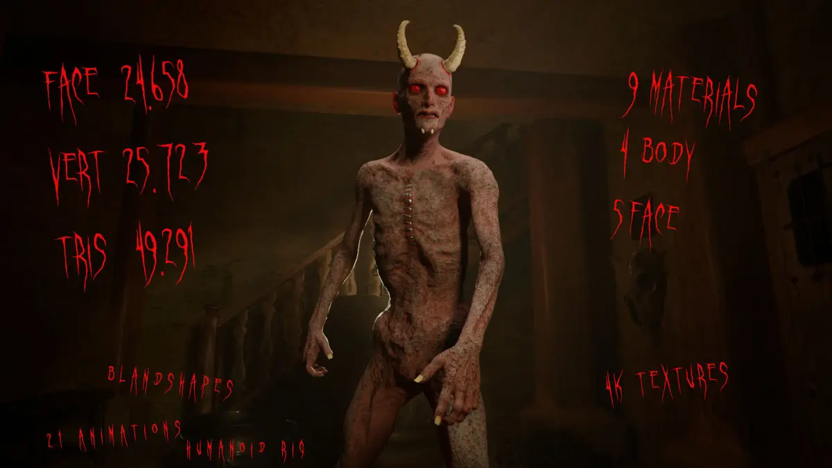 The Demon game character for Horror gamesA unique character, The Demon, specially created for your game, designed to be versatile for the modern game.3d model of a realistic character of a The Demon creature.The character have detailed facial expressions. To do this, the character were equipped with additional bones:c_eyebrow_full_l, c_eyebrow_01_end_l, c_eyebrow_01_l, c_eyebrow_02_l, c_eyebrow_03_l, c_eyebrow_full_r, c_eyebrow_01_end_r, c_eyebrow_01_r, c_eyebrow_02_r, c_eyebrow_03_r, c_jawbone_x, c_lips_smile_l, c_lips_smile_r, eyelid_bot_l, eyelid_bot_r, eyelid_top_l, eyelid_top_r.