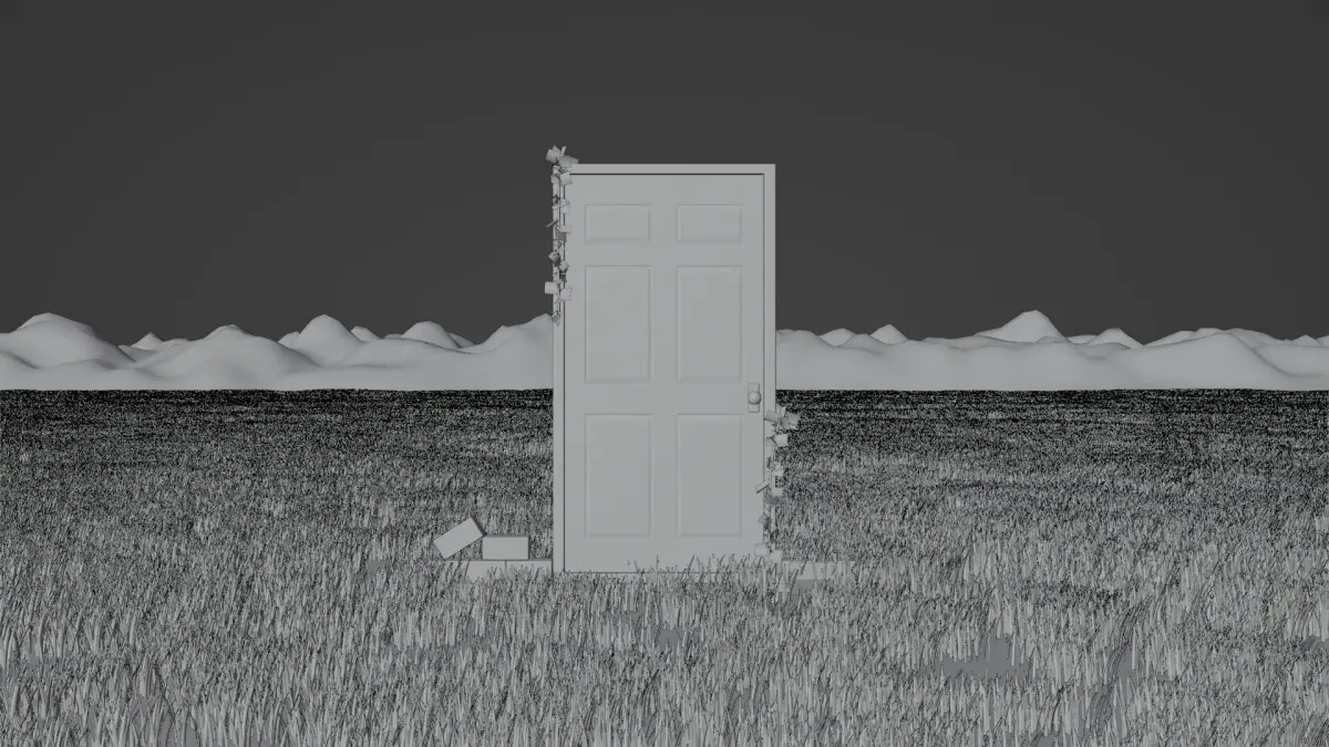 The blender files contain the following objects with descriptions:-Area --> Area light source;-Area.001 --> Area light source;-Brick --> Mesh object-Brick_1 --> Mesh object-Brick_2 --> Mesh object-Brick_3 --> Mesh object-Brick_4 --> Mesh object-Brick_5 --> Mesh object-Brick_6 --> Mesh object-Brick_7 --> Mesh object-Clouds --> Mesh object with volumetric material-Door --> Mesh object-Door_Frame --> Mesh object-Dooor_Knob --> Mesh object-Door_Sill --> Mesh object-Empty --> Empty object-Camera --> Camera parented to empty object-Fog --> Mesh object with volumetric material-Grass --> Mesh object-Ground --> Mesh object with 2 grass particle systems-Leaf --> Mesh object-Mountaion --> Mesh object-Sun --> Sun light source;-Vine_1 --> Curve object with geometry nodes;-Vine_2 --> Curve object with geometry nodes;