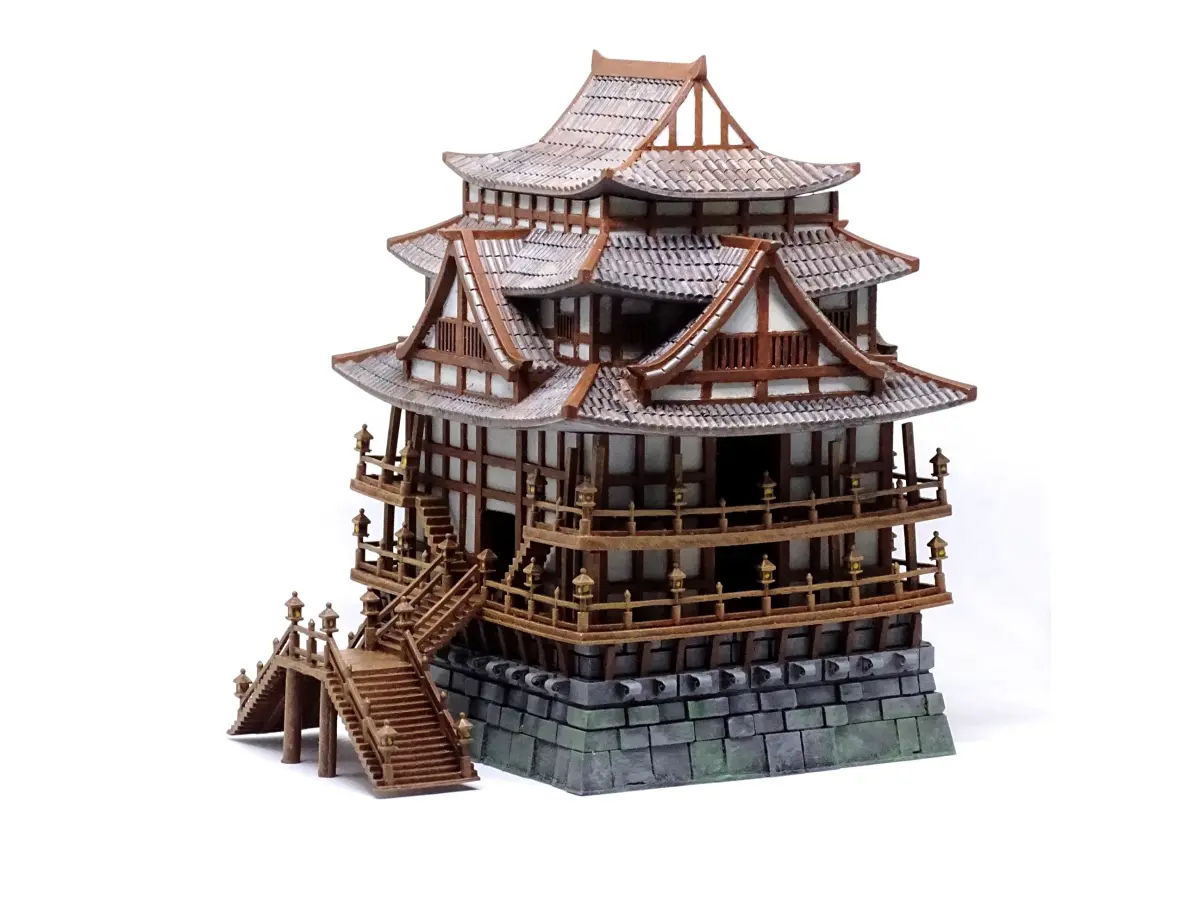 I designed this model myself with Blender. I used the images of the original castle as a references but I modified some details to facilitate the 3D printing. In particular, I reduced the number of steps and tiles and increased the thickness of the beams. For the rest I tried to be as faithful as possible to the original design. I also used the Japanese castle of Osaka as a reference, especially for the shape of the roofs and tiles.