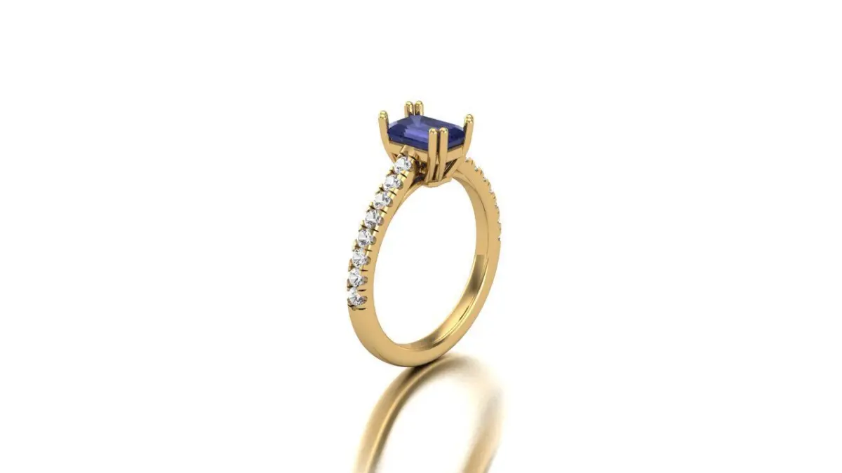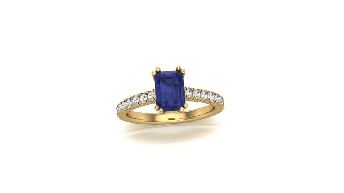 A Study in Sophistication: The Emerald Cut Sapphire with Diamond Accented Shank Ring in 14k Yellow Gold
