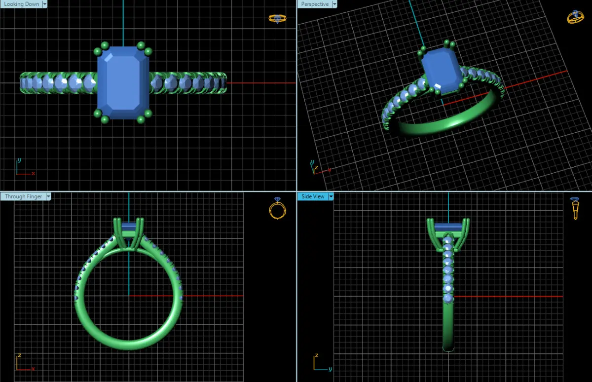 The diamonds along the shank are set in a prong or pave setting, depending on the specific design of the ring. This setting, characterized by its delicate prongs or closely set stones, ensures that the diamonds are securely held in place while allowing their brilliance to shine through. The uniformity of the setting ensures that the diamonds appear as a seamless line of sparkle, creating a harmonious and elegant aesthetic.