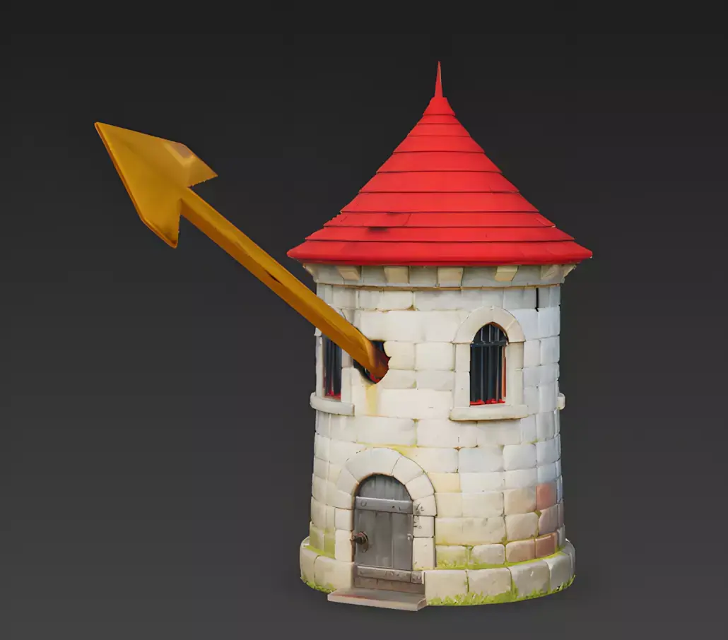 Massive Golden Arrow-HeadThe standout feature is the giant, solid gold arrow protruding from the side of the tower. The arrow-head features a slightly hammered, reflective metallic texture, suggesting it was fired by a god, a giant, or a legendary siege engine.