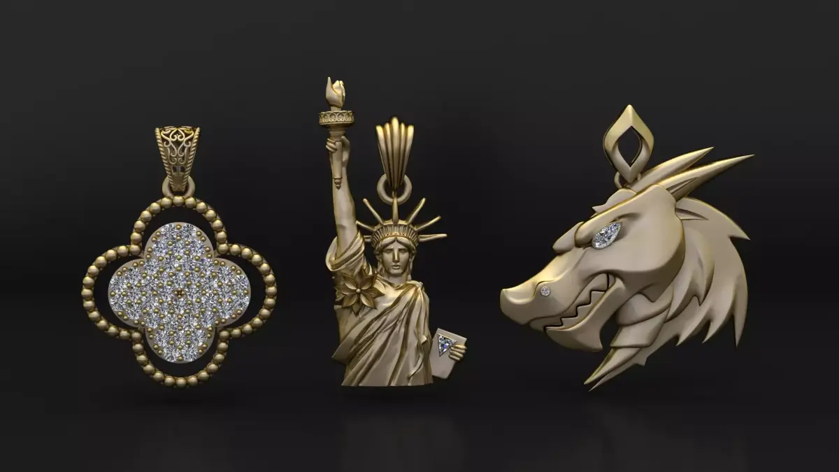 A stunning trio of luxury 3D pendants designed with elegance, precision, and symbolic artistry.Each pendant tells its own story — the Diamond Clover, Statue of Liberty, and Dragon Spirit — all crafted in radiant gold and detailed with brilliant-cut stones.