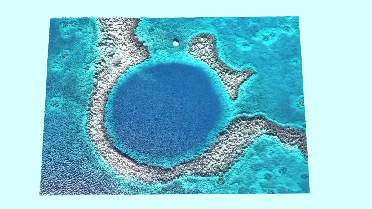 DescriptionThe Great Blue Hole Island. The Great Blue Hole is a large marine sinkhole off the coast of Belize. It lies near the center of Lighthouse Reef, a small atoll 70 km (43 mi) from the mainland and Belize City. The hole is circular in shape, 318 m (1,043 ft) across and 124 m (407 ft) deep. It has a surface area of 70,650 square metres (760,500 sq ft). It was formed during several phases of the Quaternary glaciation when sea levels were much lower. Analysis of stalactites found in the Great Blue Hole shows that formation took place 153,000, 66,000, 60,000, and 15,000 years ago. As the ocean began to rise again, the cave was flooded. The Great Blue Hole is a part of the larger Belize Barrier Reef Reserve System, a UNESCO World Heritage Site. The site was made famous by Jacques Cousteau, who declared it one of the top five scuba diving sites in the world. In 1971 he brought his ship, the Calypso, to the hole to chart its depths. Investigations by this expedition confirmed the hole's origin as typical karst limestone formations, formed before rises in sea level in at least four stages, leaving ledges at depths of 21 m (69 ft), 49 m (161 ft), and 91 m (299 ft). Stalactites were retrieved from submerged caves, confirming their previous formation above sea level. Some of these stalactites were also off-vertical by 5 in a consistent orientation, indicating that there had also been some past geological shift and tilting of the underlying plateau, followed by a long period in the current plane. The tilt indicates that this was movement of the land, rather than a rise in sea level alone. The initial measured depth of the Great Blue Hole was about 125 m (410 ft) which is the most often cited depth up to this day. An expedition was conducted in the summer of 1997 to collect core samples from the Blue Hole's floor and document the cave system. To accomplish these tasks, all of the divers had to be certified in cave diving and mixed gases. In December 2018, two submarines descended into the Blue Hole in an attempt to map its interior. Using sonar scanning, the team was nearly able to complete a 3-D map of the 1,000-foot-wide (300 m) hole. One of their discoveries was a layer of hydrogen sulfide at a depth of approximately 300 feet (91 m). The water at that depth and below becomes dark, anoxic and devoid of life. The submarine expedition also discovered the bodies of two divers at the bottom, out of three believed to have gone missing while diving there, and reported them to Belizean authorities. Out of respect, the crew declined to bring the bodies back to land, thus leaving them buried at sea.