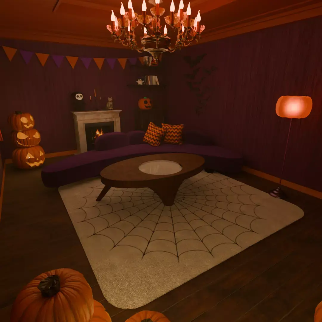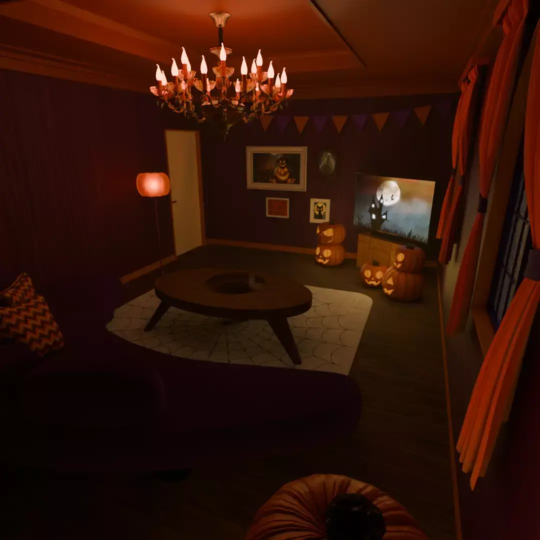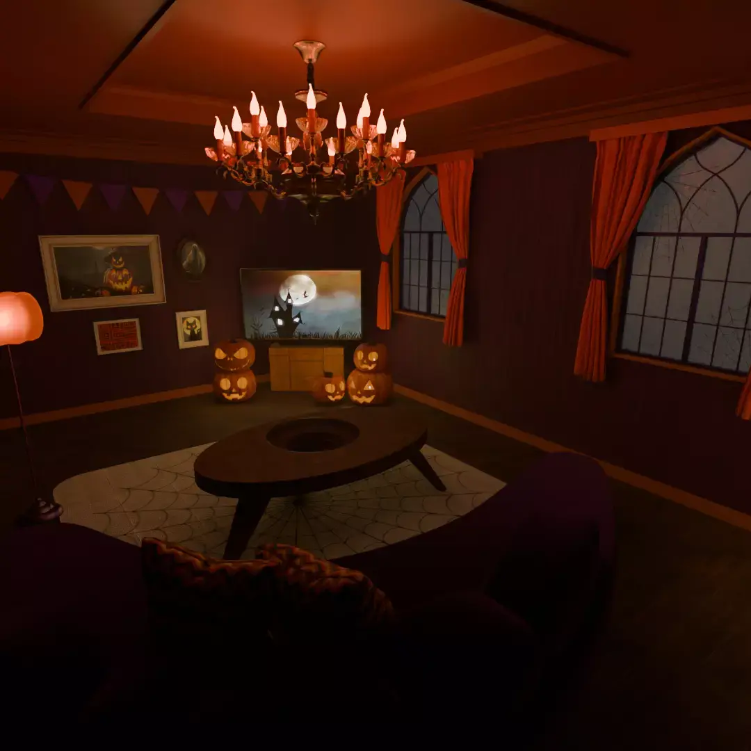 This product is a “Halloween Room” 3D model created in Blender.It recreates a space illuminated by jack-o'-lanterns, chandeliers, candles, and decorations.This room combines a dark atmosphere with cute whimsy, enabling truly Halloween-like effects.