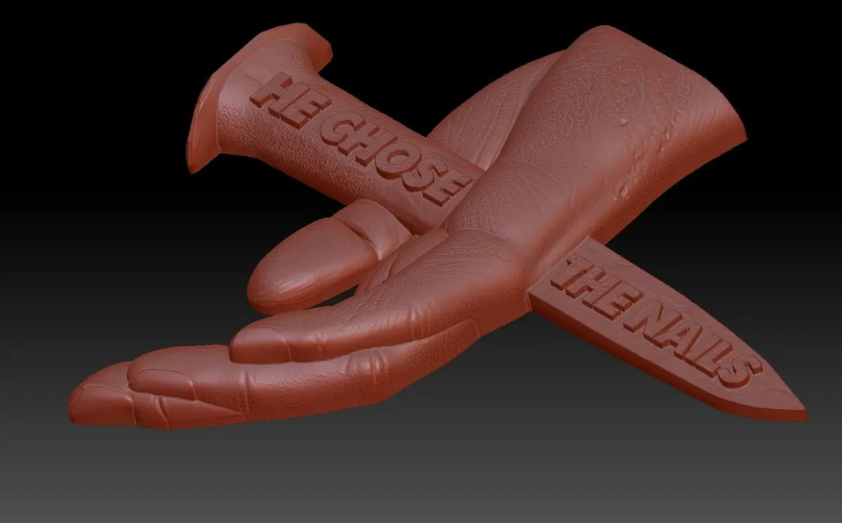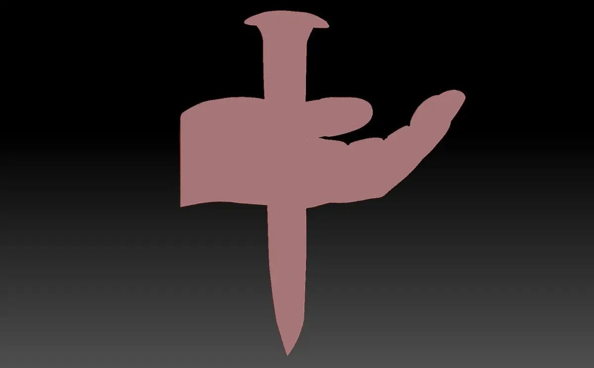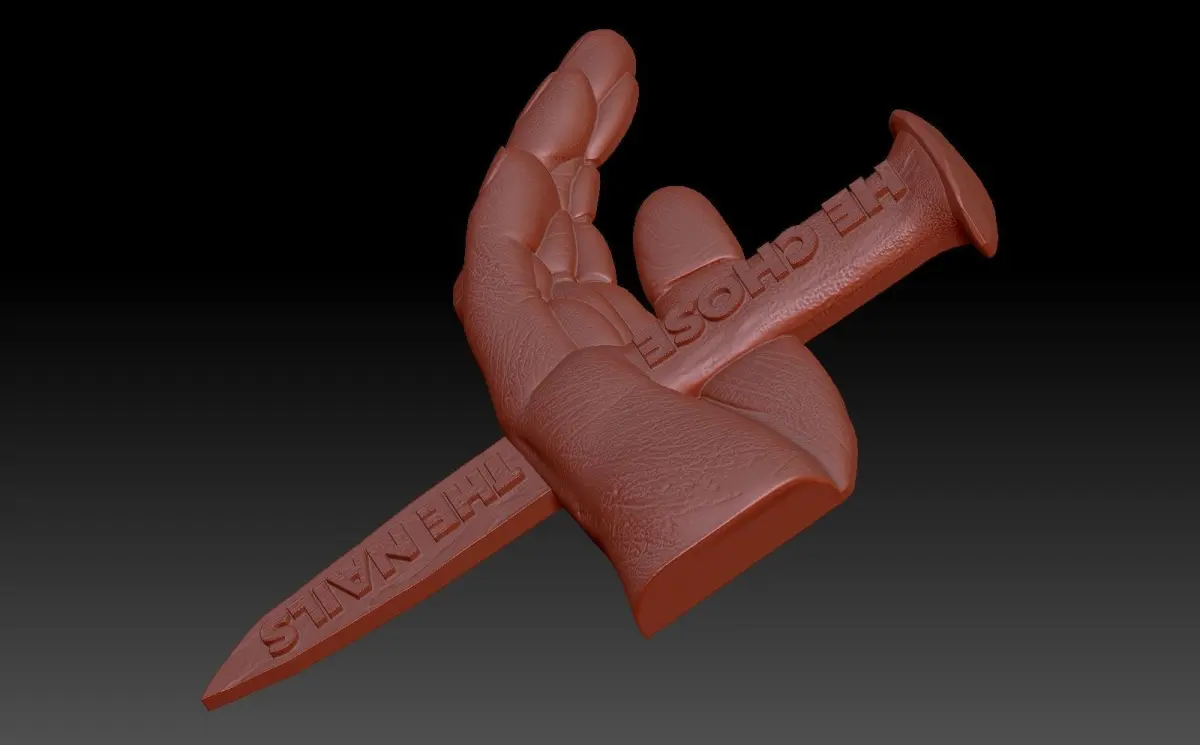 A 3D model depicting a bas-relief of a hand pierced by a dagger. There is an inscription on the dagger. The work is suitable for 3d and CNC machine tools.