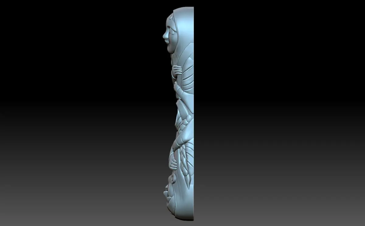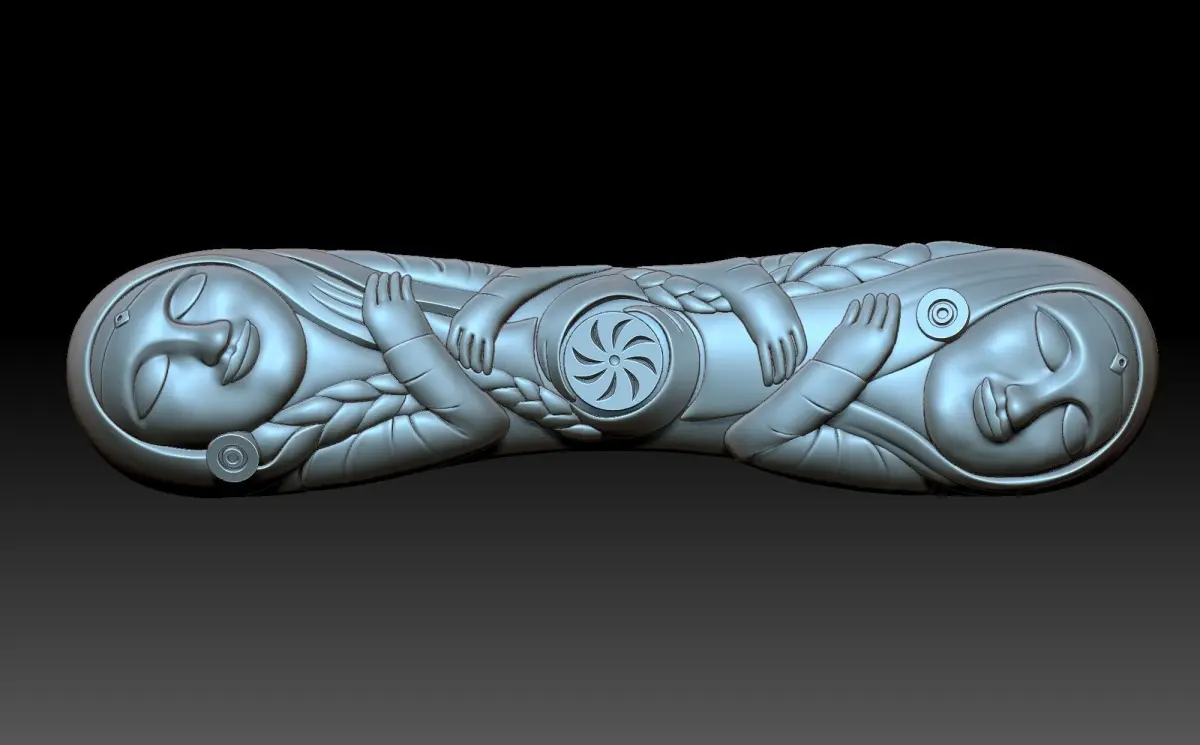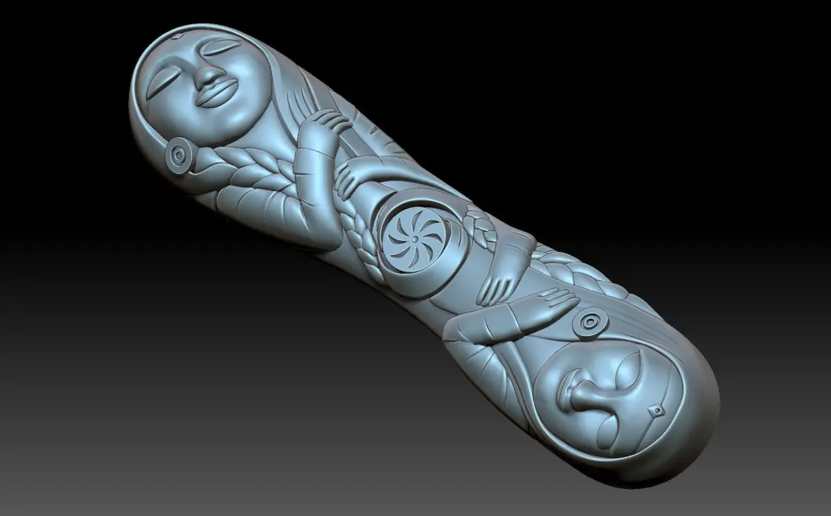 a 3D model of the handle, made in the image of girls with their eyes closed. The model is symmetrical .The handle is a part of the product that serves to hold it with your hand.