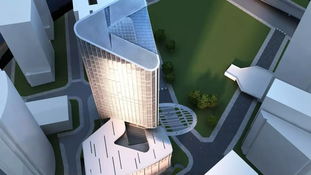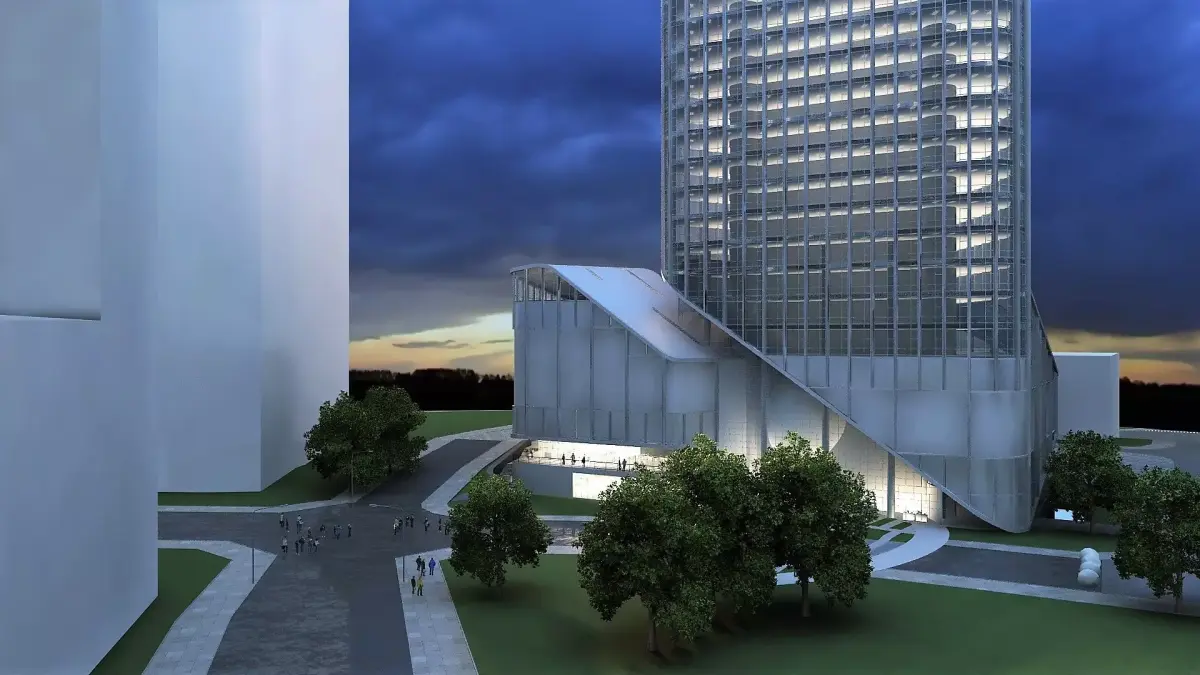 Exterior scene of a headquarders building. Low-poly crowd, 3 vrmesh trees.