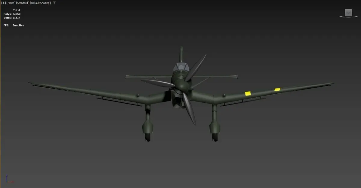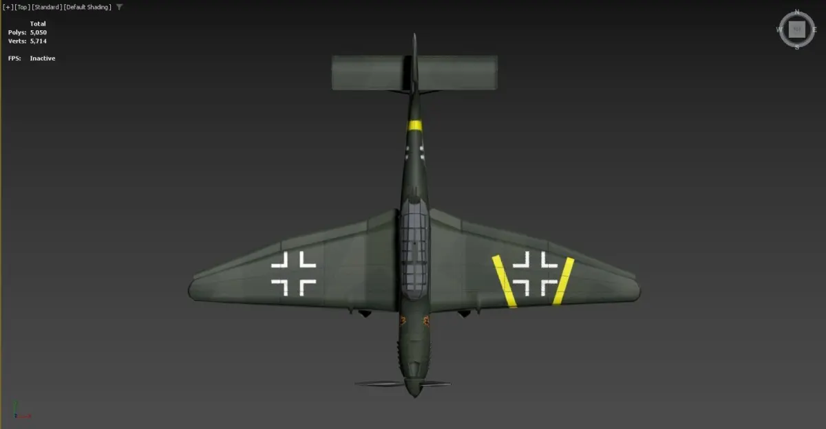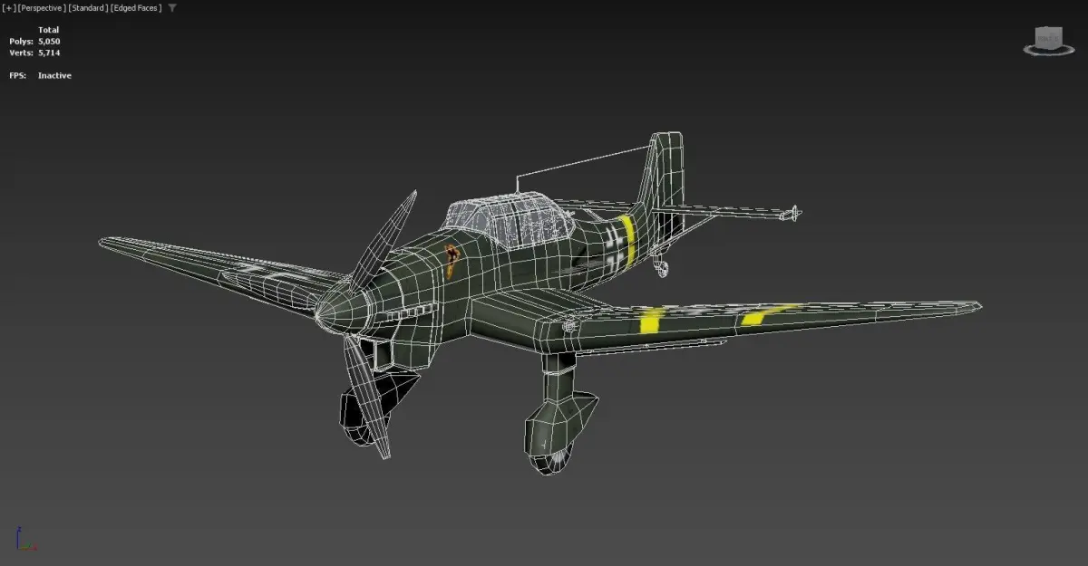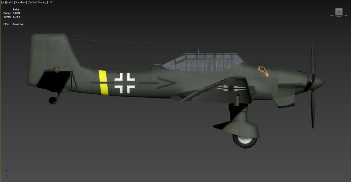 The image shows a 3D model of a military aircraft, specifically a World War II-era German dive bomber, the Junkers Ju 87 Stuka. The aircraft is rendered in a 3D modeling software with a dark green color scheme and features distinctive markings, including a yellow band on the wing and tail, and a black cross on the wings and fuselage. The cockpit canopy is detailed, and the propeller is visible at the front of the aircraft. The model's polygon and vertex count are displayed in the top left corner of the image.