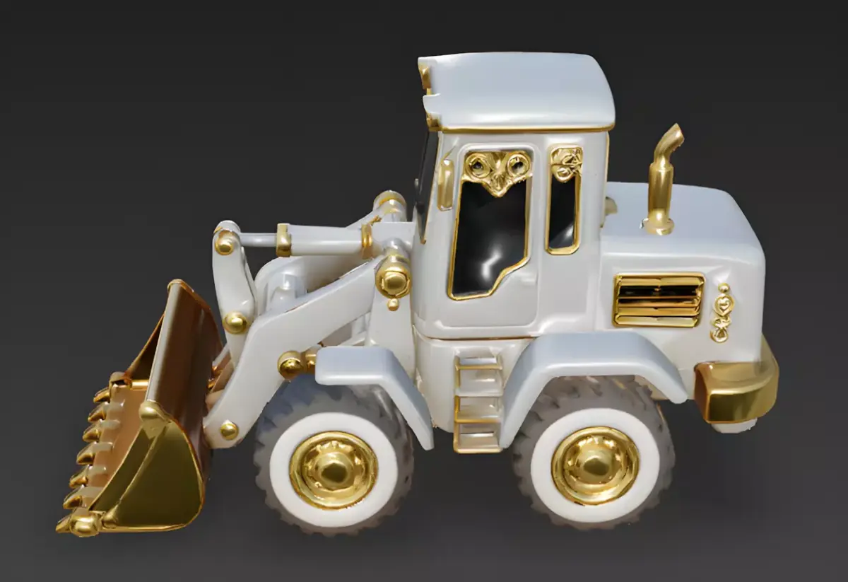 Solid Gold Front BucketTo emphasize its elite status, the model is equipped with a massive, solid gold digging bucket. The polished metallic finish features realistic tooth-edge detailing, providing a stunning visual contrast to the white chassis and signaling its high-value role.