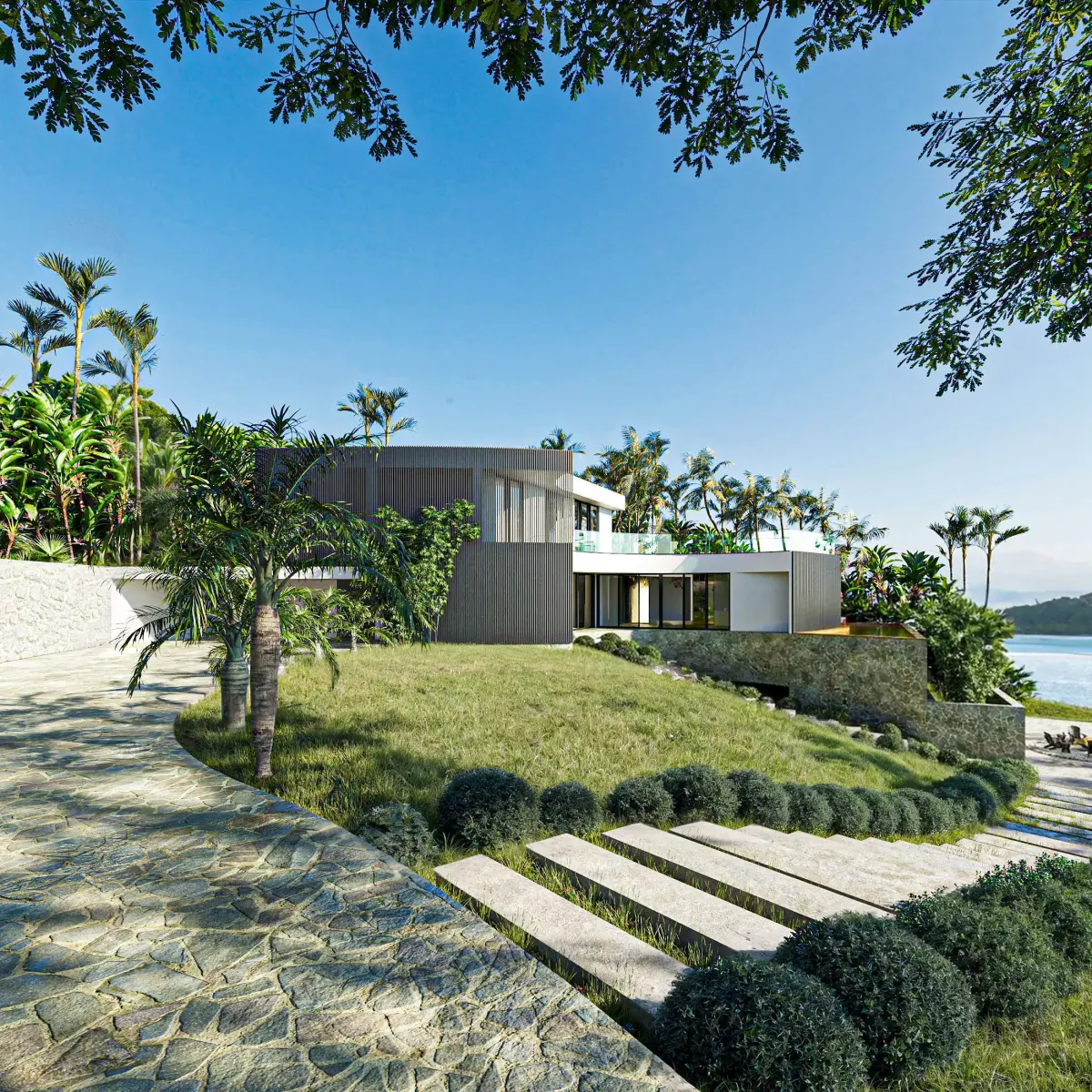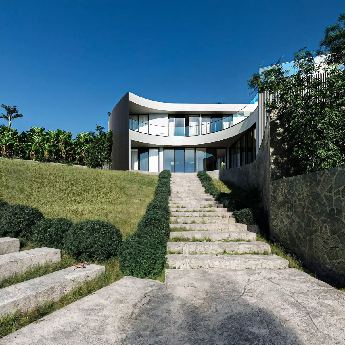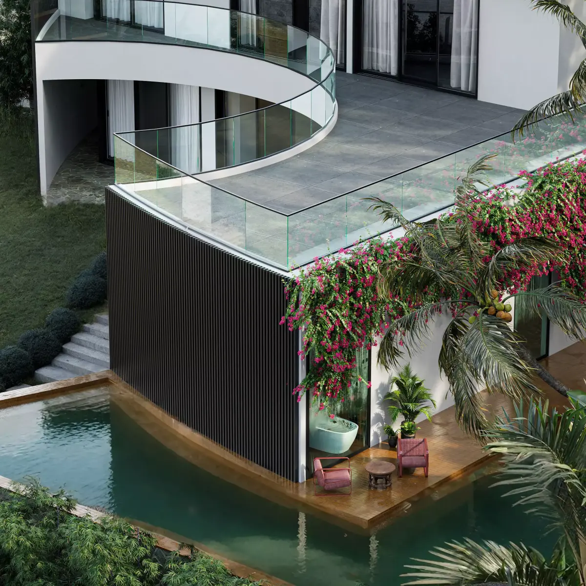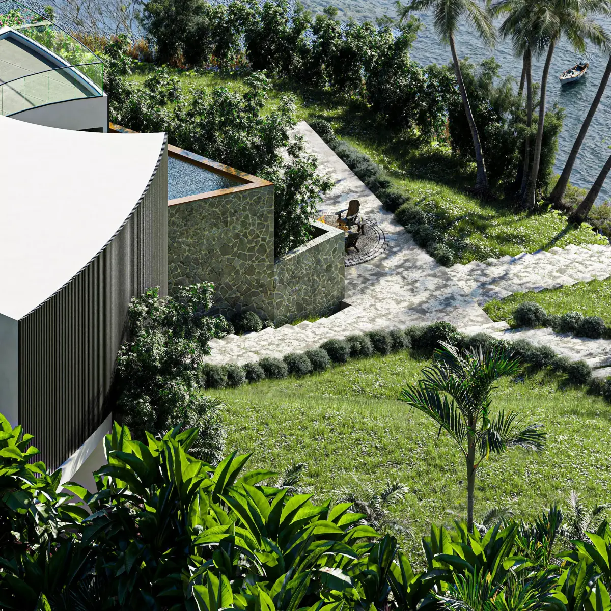 High-quality 3D visualization of a modern minimalist villa set in a lush tropical riverside environment. The scene features a contemporary white residence with curved glass facades, surrounded by palm trees, dense greenery, and natural landscaping. Two rustic wooden boats rest in the calm reflective water at the foreground, adding depth and storytelling to the composition.