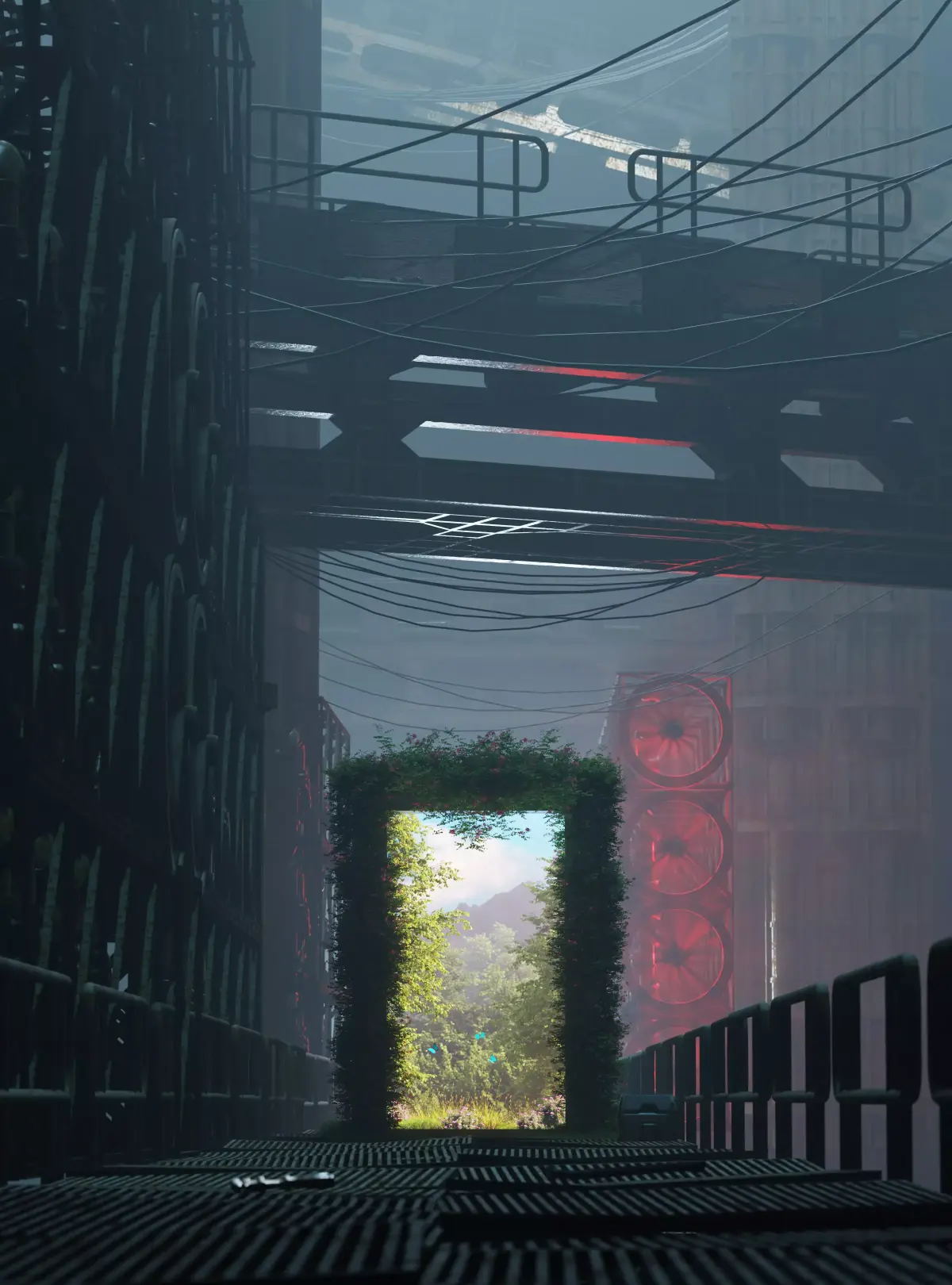 A conceptual 3D scene depicting the contrast between a dying industrial world and a living oasis of nature. The artwork was created to convey the idea of hope in the darkest of places.