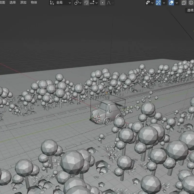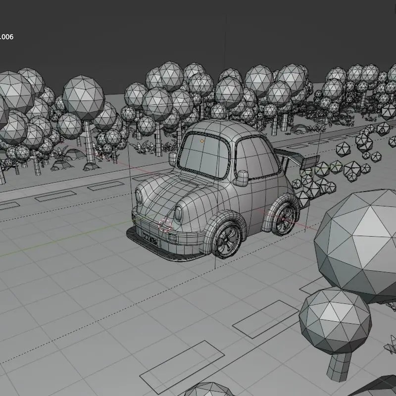 Blender blue car 3d model drive on the road, contain light and materials. it is motion.Animation of a moving car model.native file format is blender, contain obj and fbx.