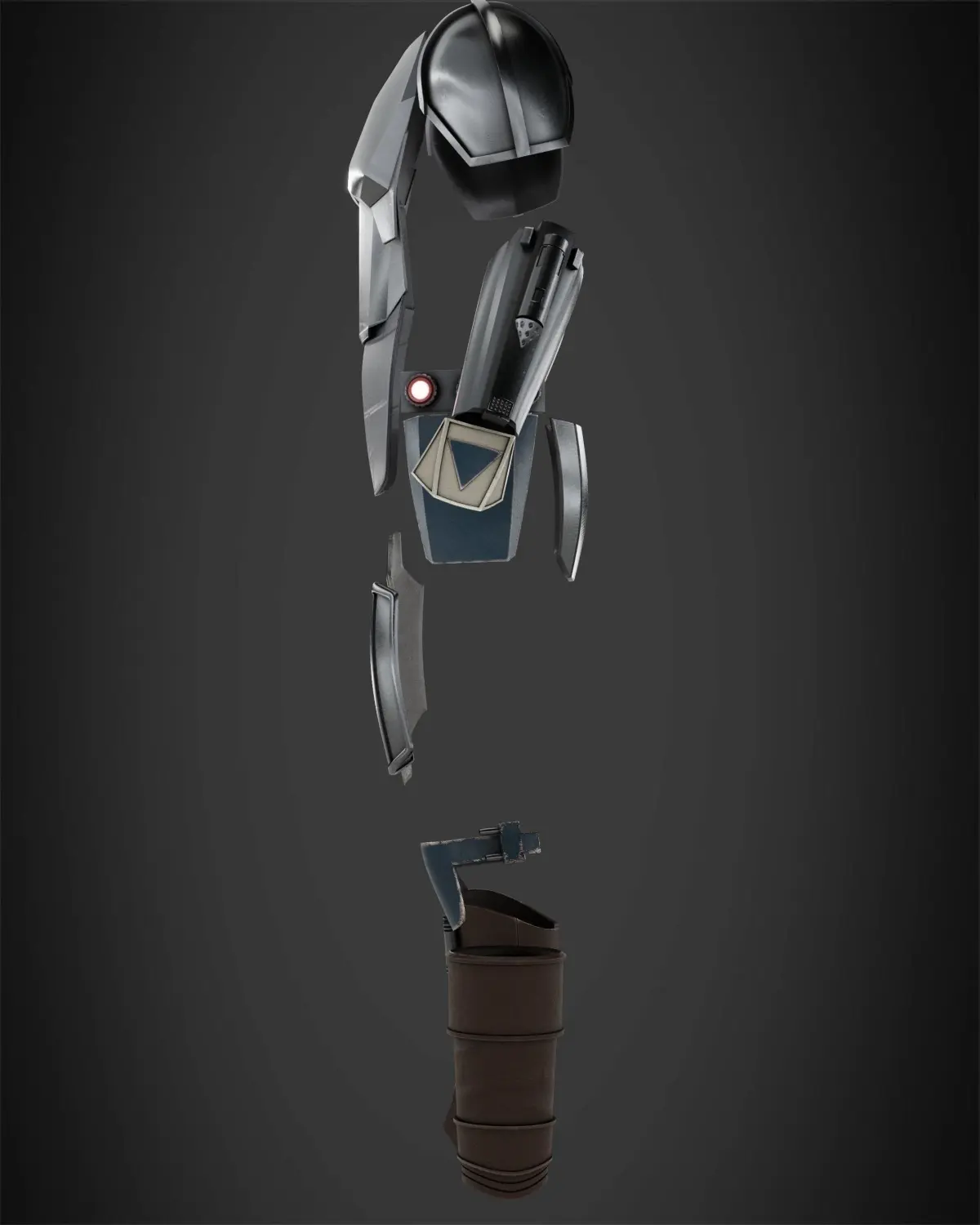 Djarin was a warrior who initially wore a set of durasteel Mandalorian armor utilizing pieces made from beskar, which included a shoulder pauldron, helmet, and heartplate. The bounty hunter was able to begin replacing some of the damaged armor pieces with his payment of beskar from the Client; eventually, he achieved a full beskar body suit of a helmet, plated vest, two pauldrons (one bearing his signet, the mudhorn), two vambraces, two gauntlets, two greaves, and two boots. He also earned a jetpack made from beskar, which could be controlled remotely when he was not wearing it. Djarin's final suit also included non-beskar components, including bandoliers, a cape, and a belt with a pistol holster.