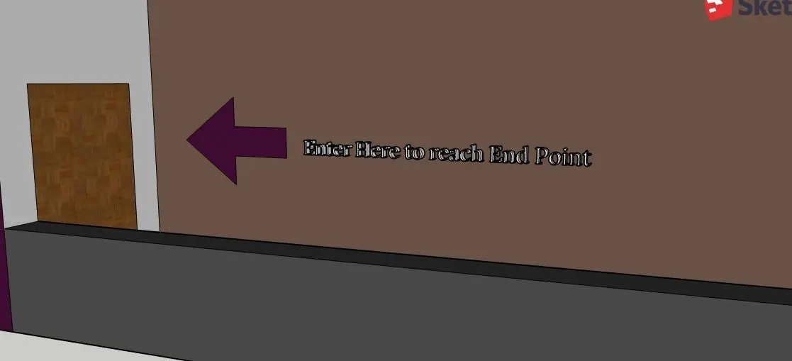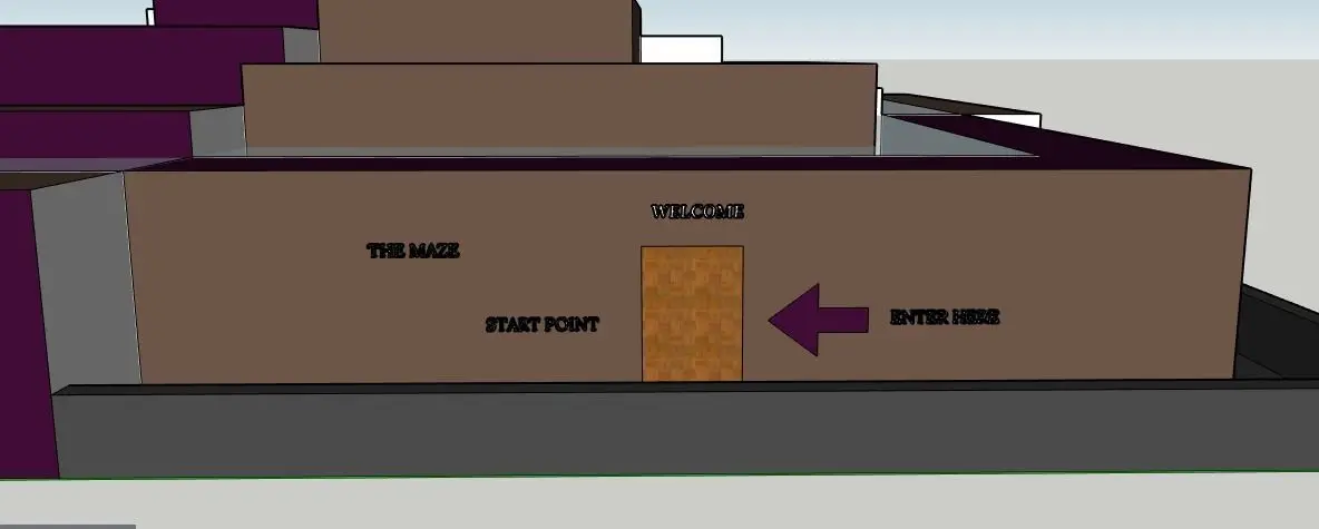 The Maze, a video game concept created for speed, action, endurance. Welcome to the start point and reach the End Point in the minimum time span. Hurdles, men with weapons to stop you from moving forward. All Doors are wooden except for one that is white as the wall color, just to disguse the contestant. The contestant has to enter the tunnel and pass through the open passages. The top is covered with glass grill. No way out except through the white door. Video game creators can use this model to create a video game by the name, Get Lost, Get The Diamond or Find the Gold, hidden behind the White Door. Entrance Gate to The Maze added.