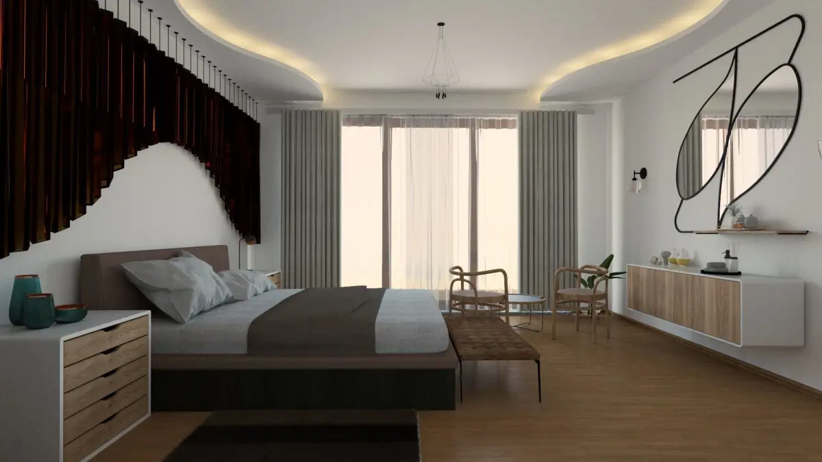Modern Bedroom designed with Sketchup and Vray , who you can see A very comfortable design and the lighting it's on the right level .The light behind the bad is design with glass material and with led light inside.