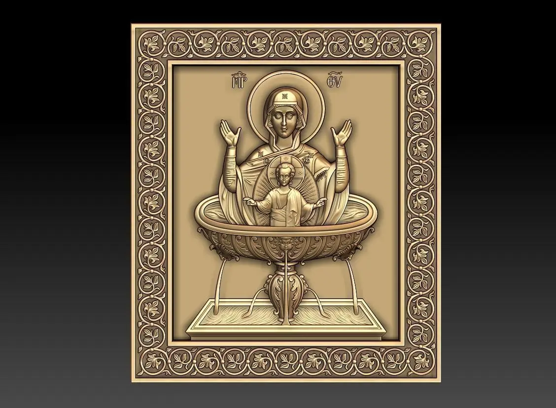 3d model Orthodox icon Mother of God of the Life-giving Spring or Life-giving Font (Greek: Ζωοδόχος Πηγή, Zoodochos Pigi, Russian: Живоносный Источник) For milling on CNC machines. This model is ONLY for cnc, it is NOT for 3d printing. Can be used in the production of souvenirs, furniture, jewelry. Files in stl format, for import to artcam, rhinoceros, 3ds max, etc. You can scale the model to any size you need.