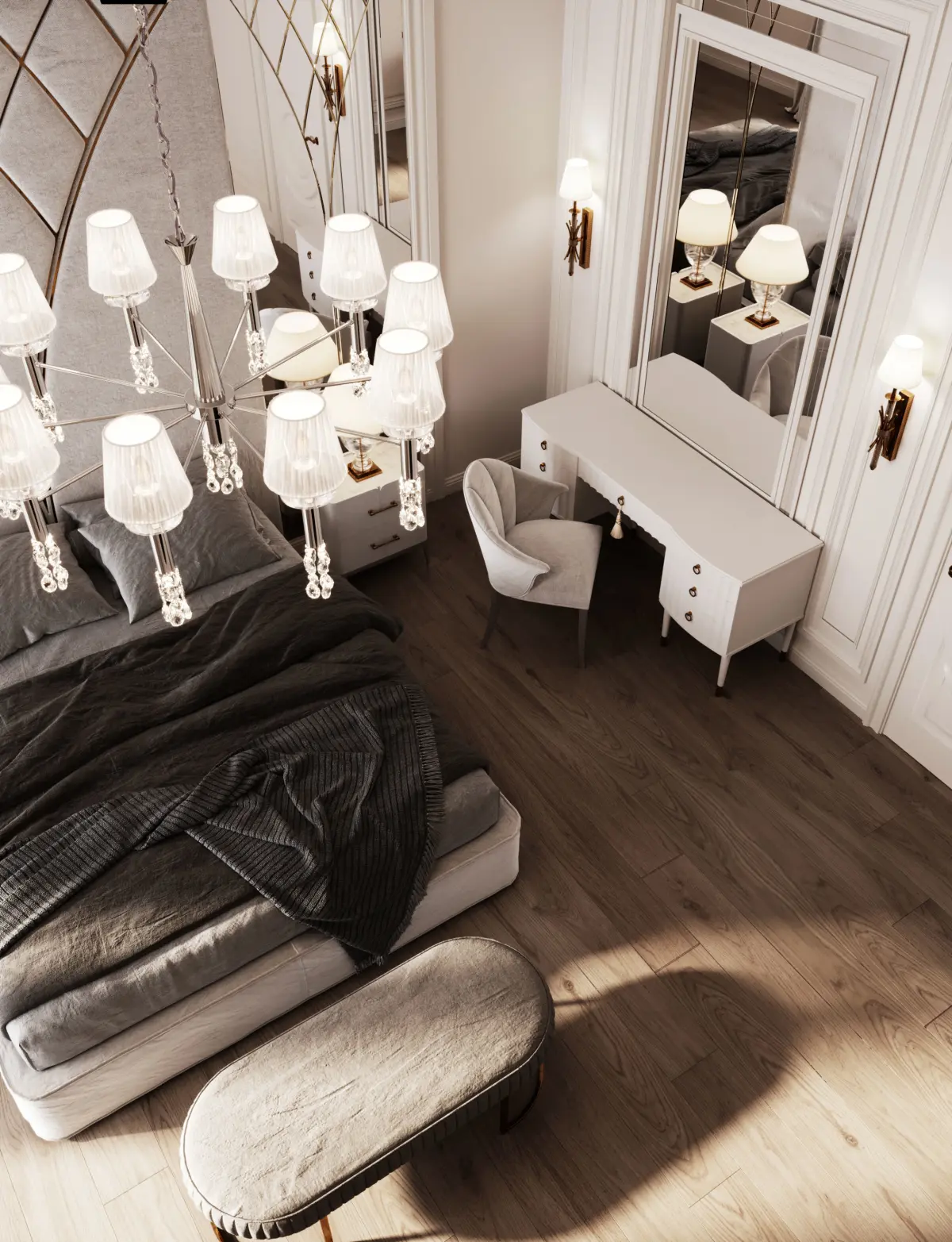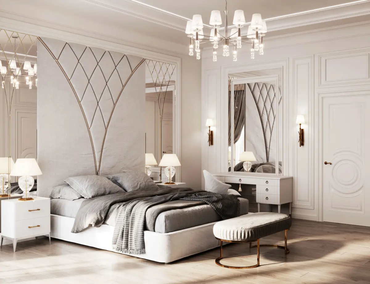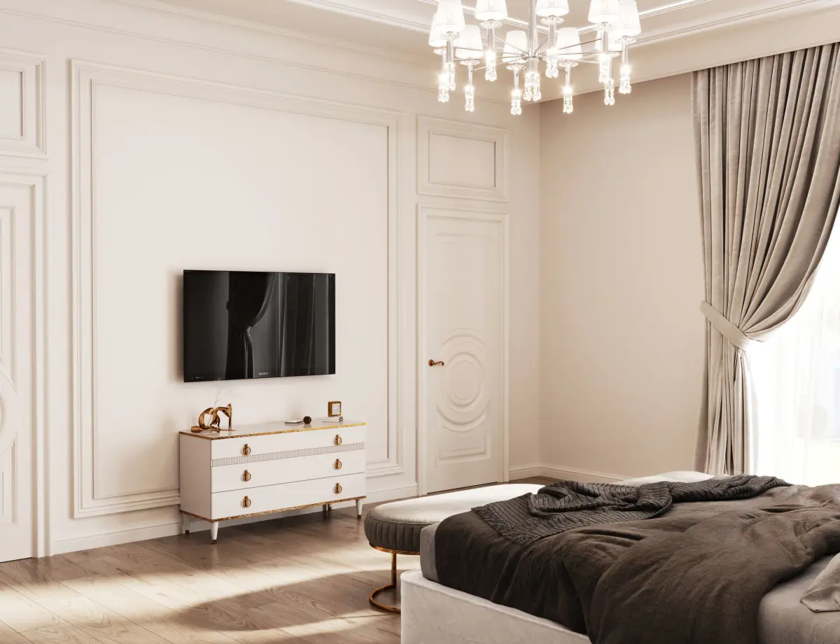 The bedroom is in the neoclassical style. In the scene there is a bedroom. All models are included, textures, materials and light are configured for Corona render