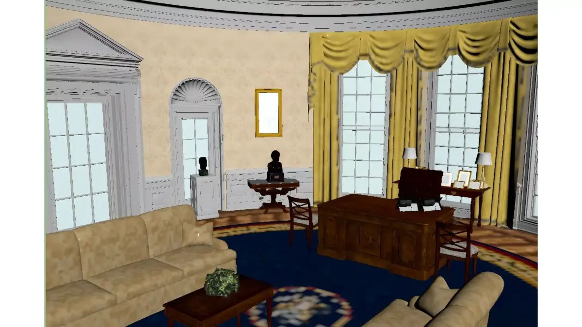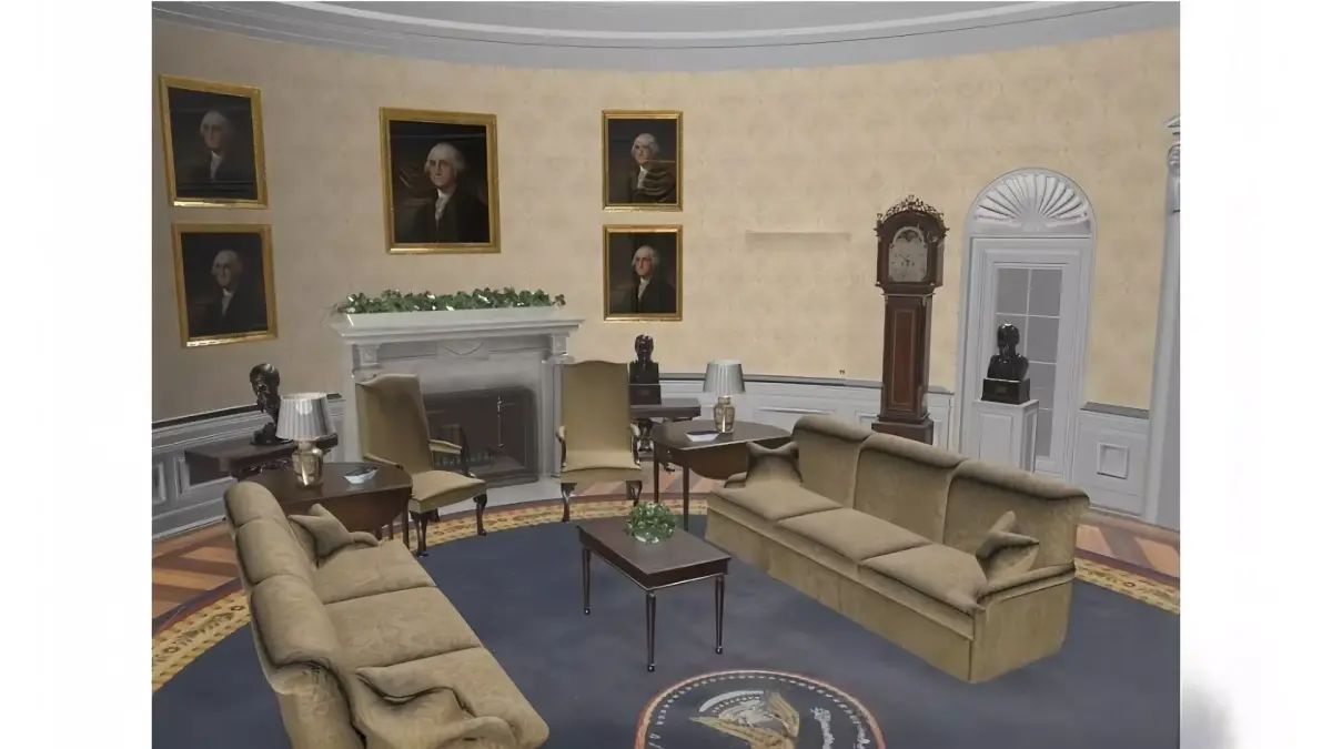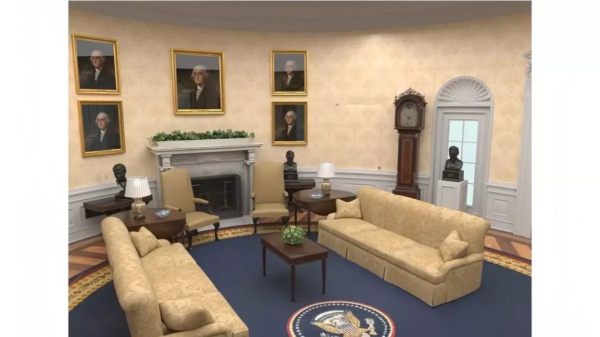 This is a scene recreation of the Oval Office in the White House. Portraits of U.S. presidents hang on the walls; the fireplace, classic beige sofas, and armchairs create a solemn and elegant atmosphere. The floor is covered with a blue carpet adorned with the presidential seal, and when paired with a vintage mantel clock and green plants, it fully embodies the authority and sense of history of this office space for the U.S. president. It is a concrete manifestation of the symbol of American political power and the inheritance of history.