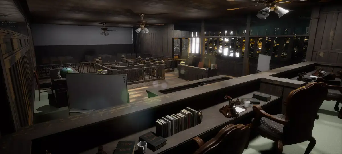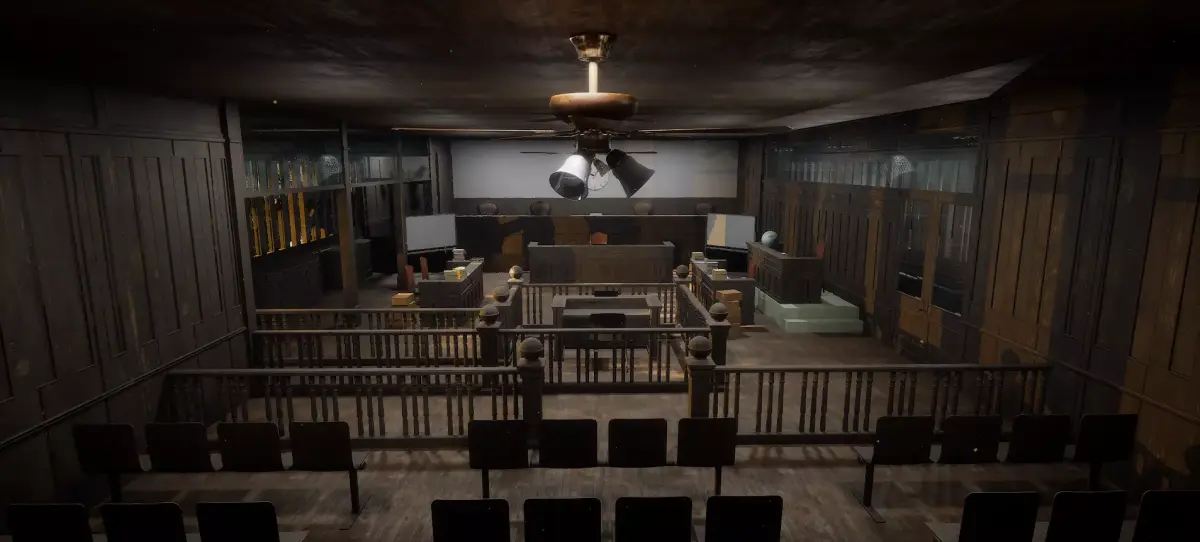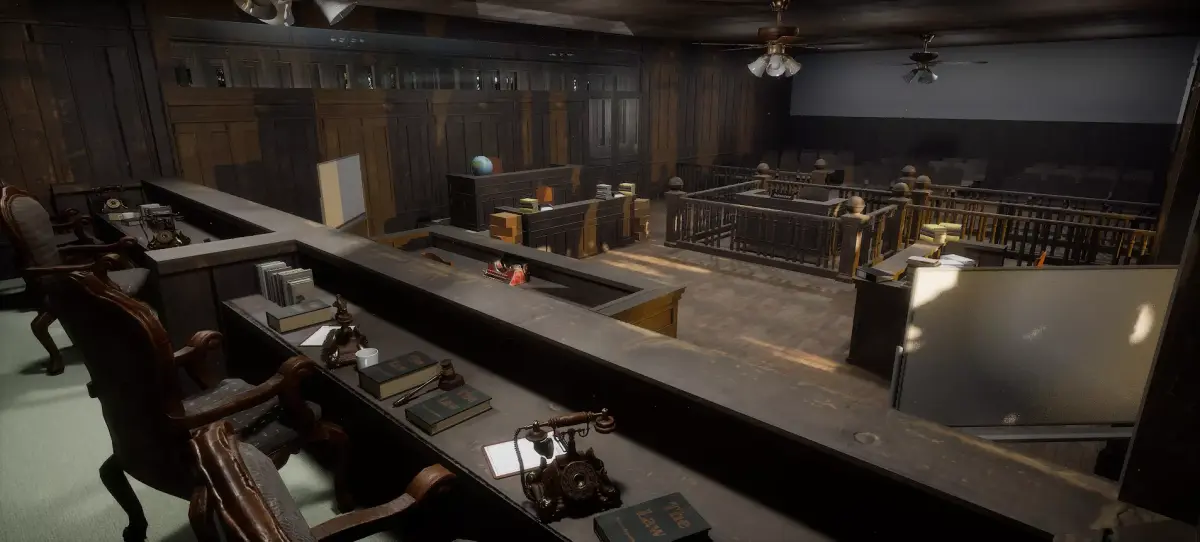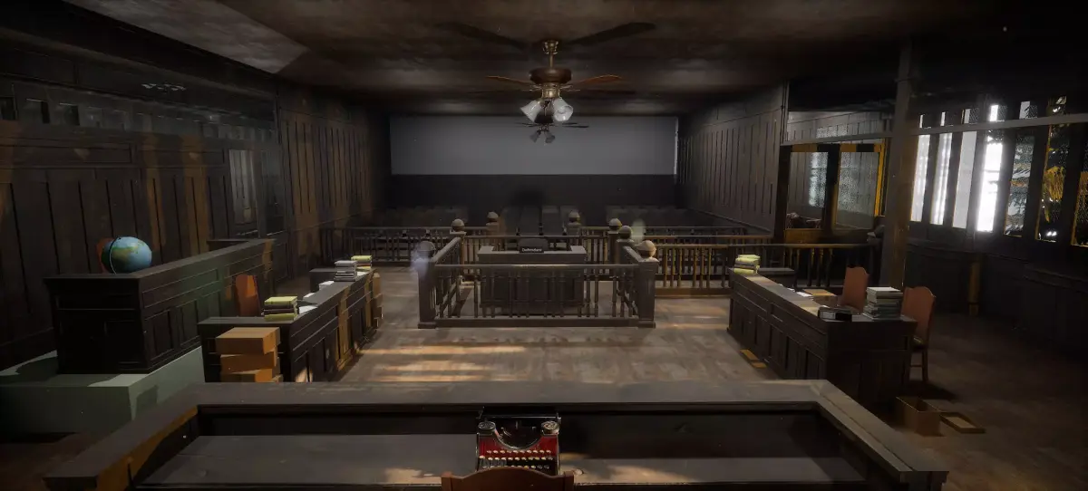 The environment reflects an aged, slightly worn courtroom — conveying decades of trials, verdicts, and stories