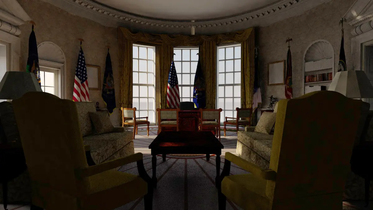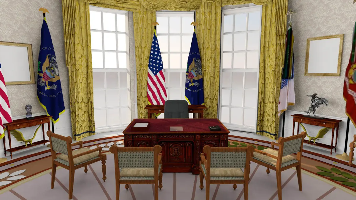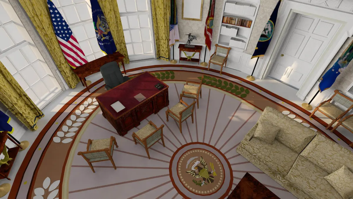 The oval-shaped room features three large south-facing windows behind the president's desk and a fireplace at the north end. It has two built-in bookcases, and four doors: the east door opens to the Rose Garden; the west door leads to a private study and dining room; the northwest door opens onto the main corridor of the West Wing; and the northeast door opens to the office of the president's secretary.