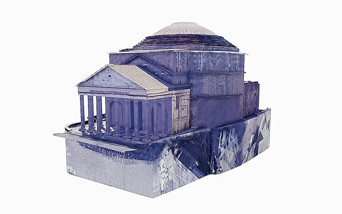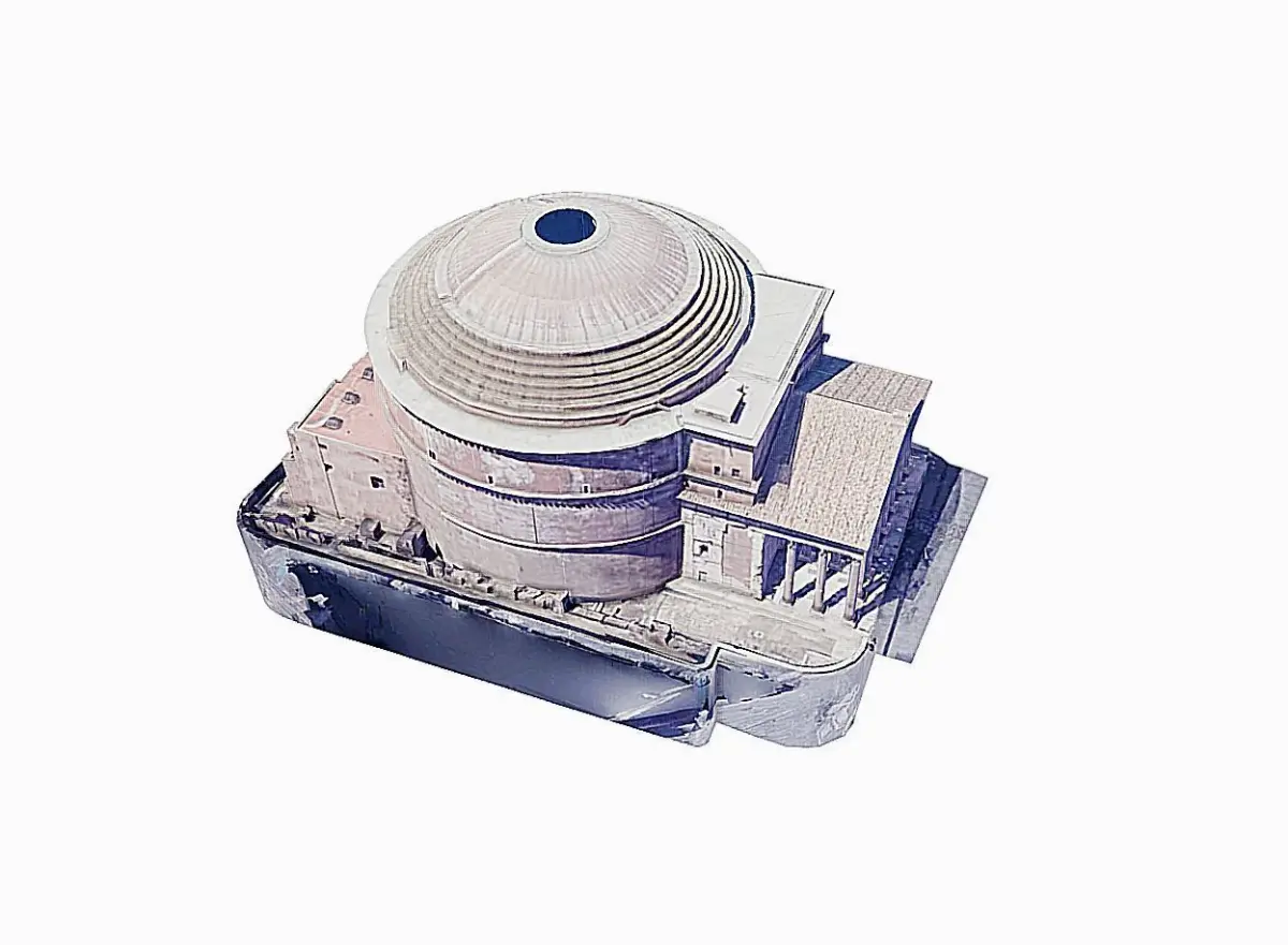 The building is cylindrical with a portico of large granite Corinthian columns (eight in the first rank and two groups of four behind) under a pediment. A rectangular vestibule links the porch to the rotunda, which is under a coffered concrete dome, with a central opening (oculus) to the sky. Almost two thousand years after it was built, the Pantheon's dome is still the world's largest unreinforced concrete dome.[3] The height to the oculus and the diameter of the interior circle are the same, 43 metres.