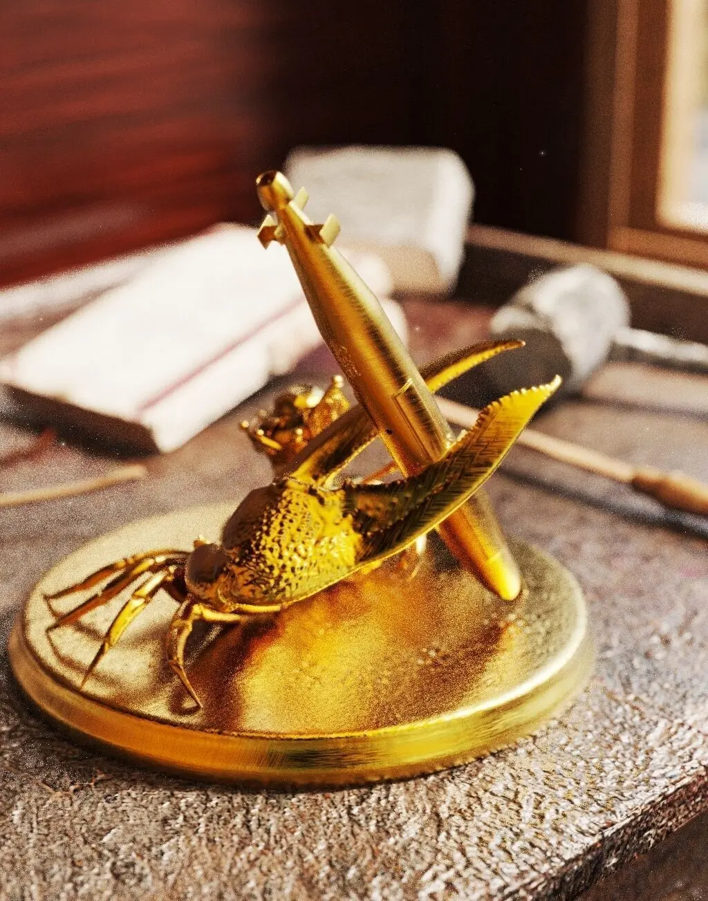 English:This sculpture depicts a crab carrying a submarine, a striking blend of the animal world and human creation. The crab, with its sturdy claws and formidable shell, conveys strength and resolve, while the submarine it bears represents ingenuity and adventure. It's a piece that encourages contemplation on the interplay between nature and technology.