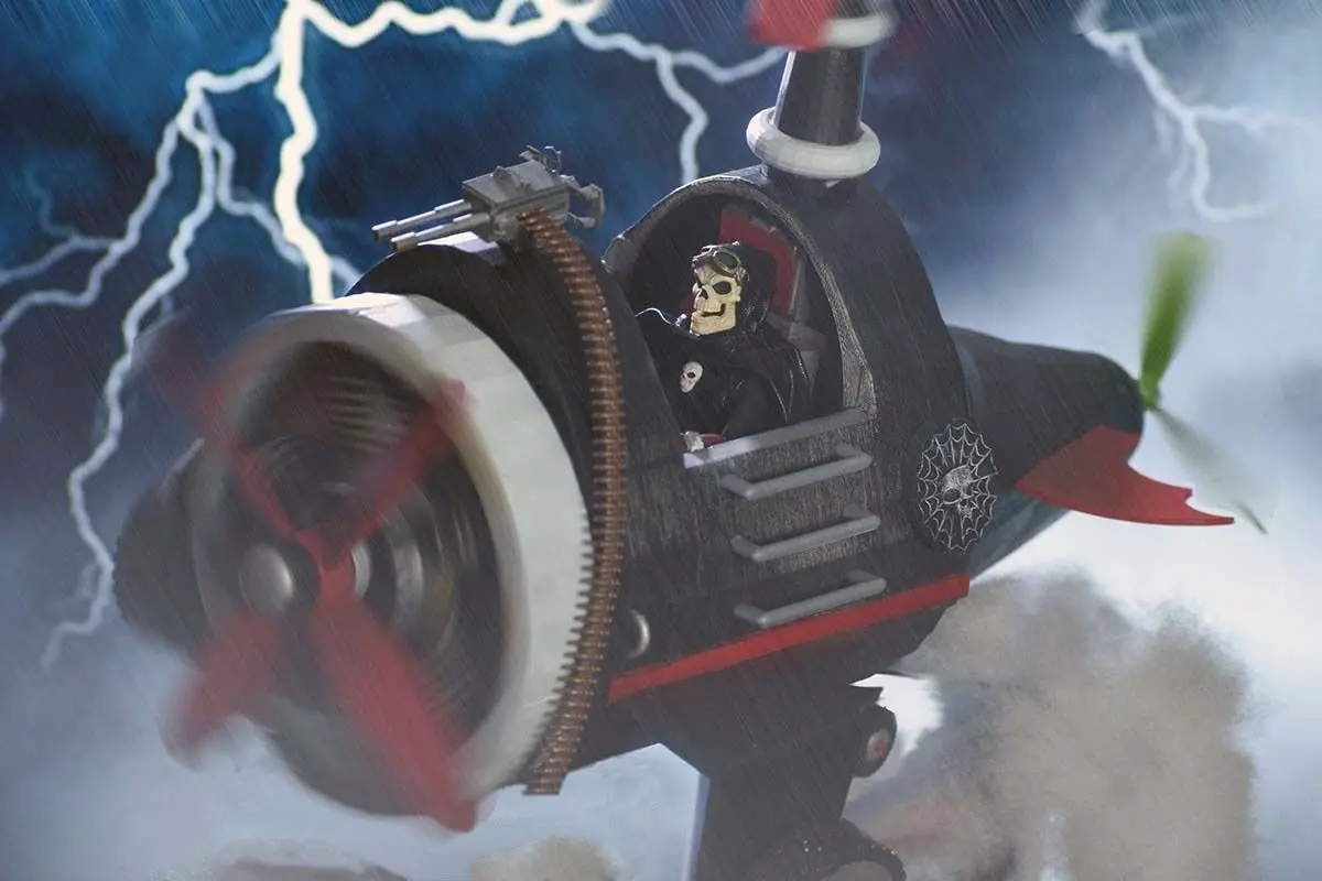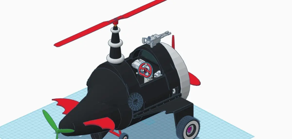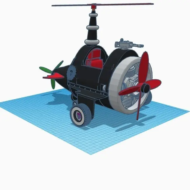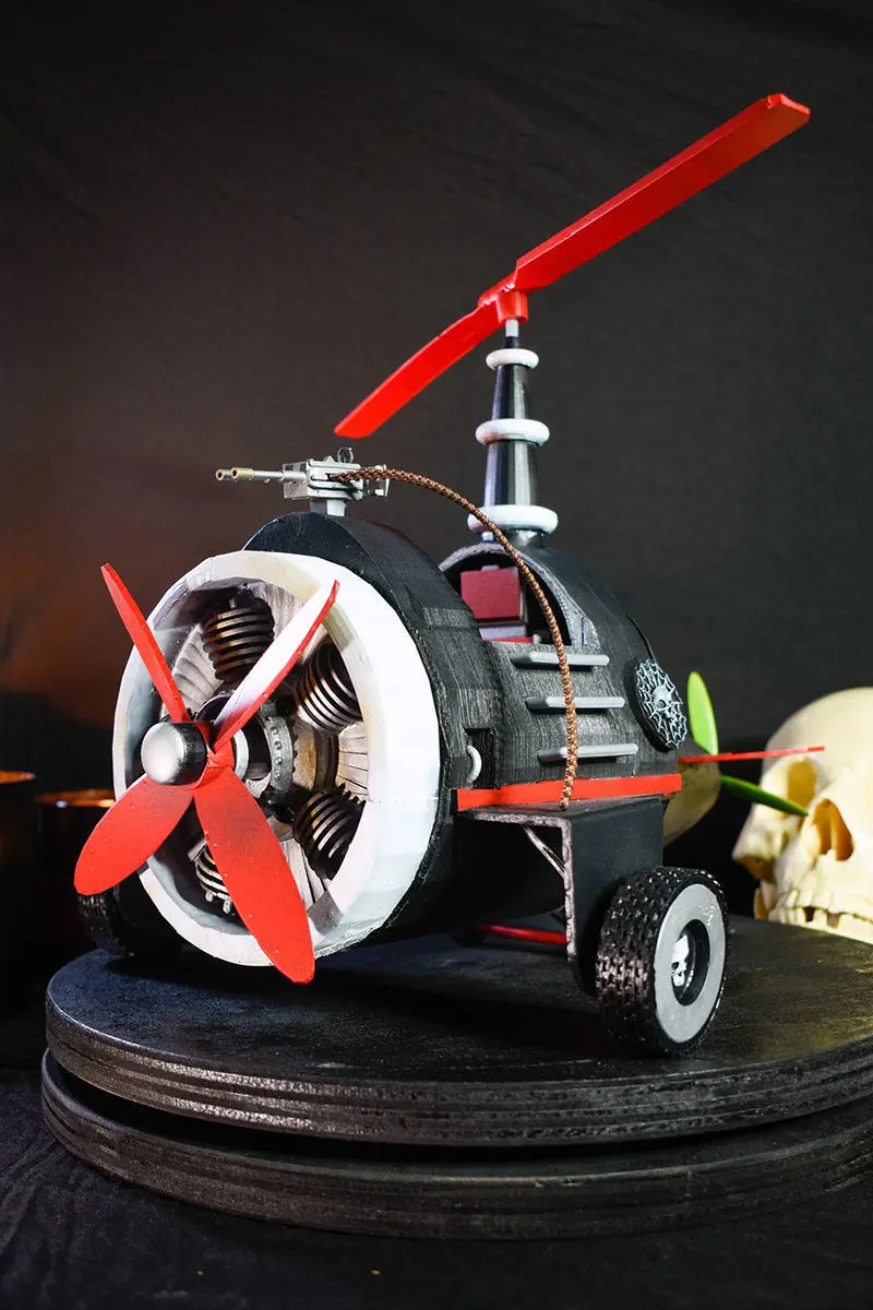 This helicopter model measures 14in length, has a blade-span of 13and fits most 1/12 figures. It is composed of 23 3d printed parts. It has 3 rotating blades, 4 rotating wheels, and a rotating steering wheel. The model requires assembly and some sanding.