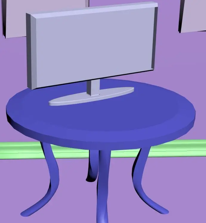 The room witch have: table, TV, 2 frame (rect and hex), plinth, Multilevel ceiling. Door and window have handle.All object divided by poligons and have`s unusual form.