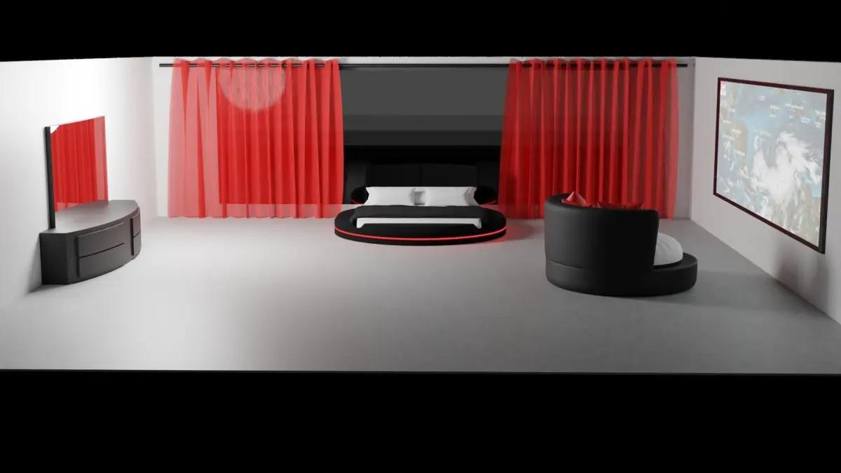 -Reflecting mirror standing on dressser.-Ultra comfortable round bed with soft pillow. Neon stripe on the base.-Transparent curtains on each side of the bed.-Ultra huge flat screen tv turned on CNN weather post.-More comfort with the round Sofa wich has 3 pillows.