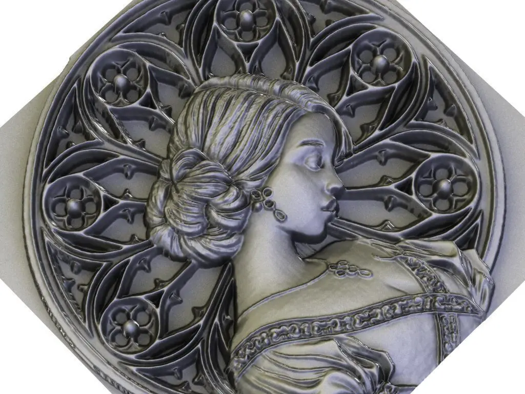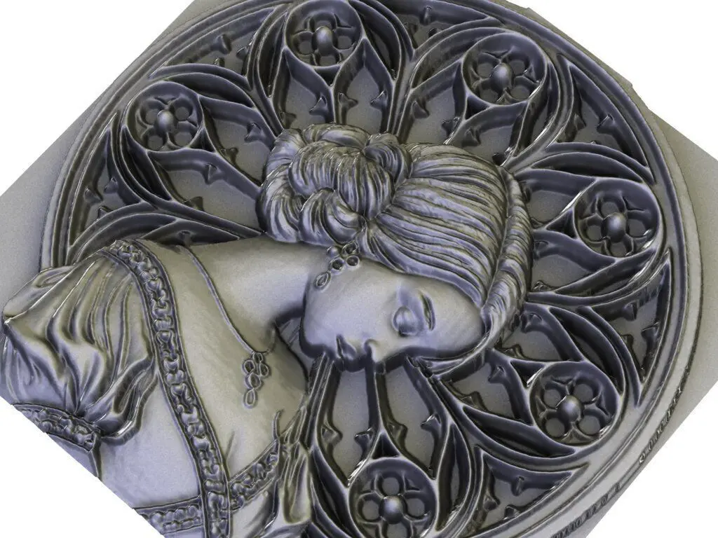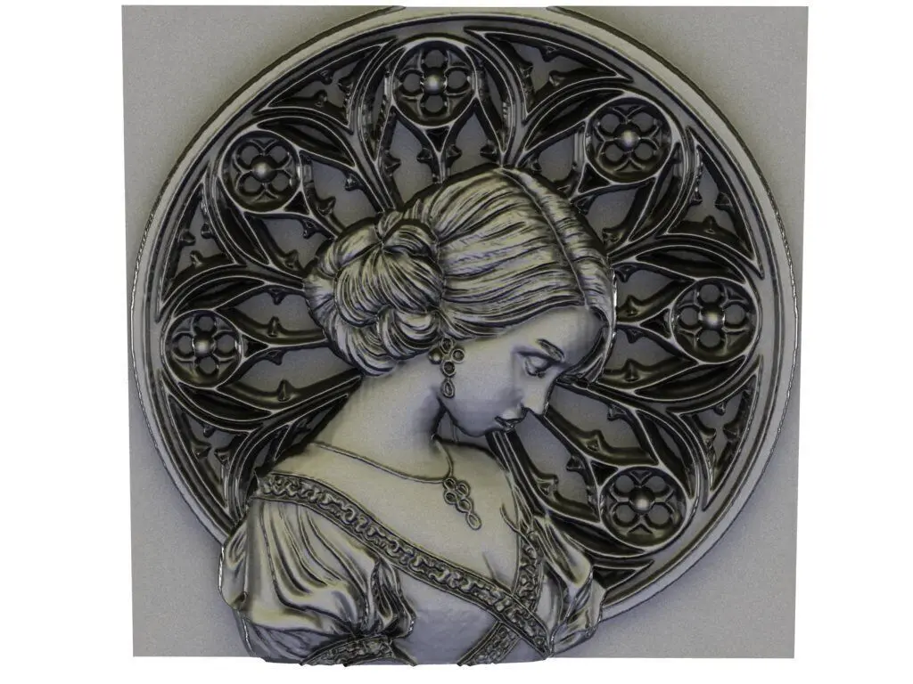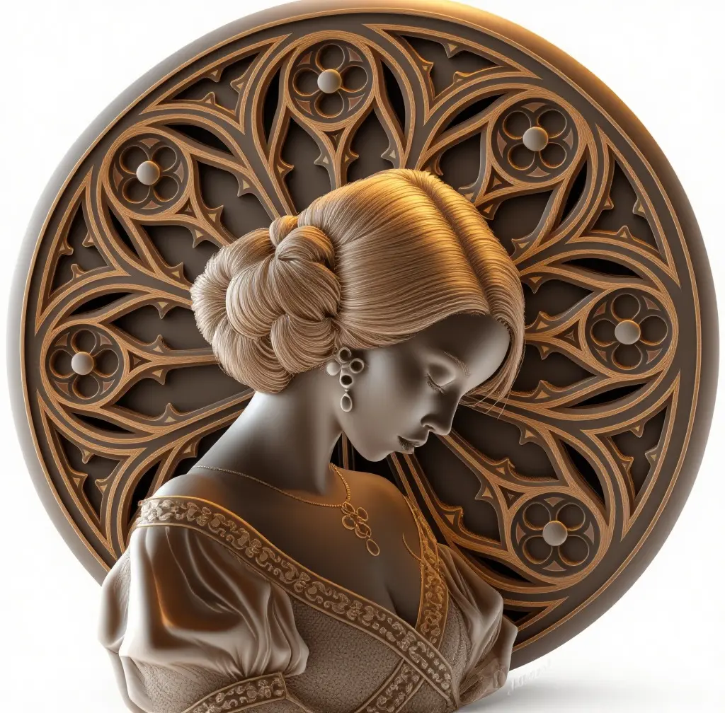 This exquisite bas-relief artwork masterfully captures the serene elegance of a young woman, delicately portrayed in classical attire and adorned with intricate jewelry. Her gentle downward gaze and composed posture evoke a sense of introspection, grace, and quiet dignity. The finely detailed textures of her gown, the carefully braided hair, and the ornate background, reminiscent of Gothic rose windows, reveal an extraordinary level of craftsmanship.
