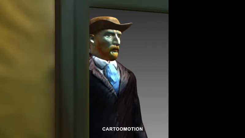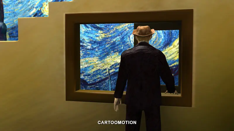 this model contains a figure of the great artist Vincent Van gogh standing behind the window looking to the sky .