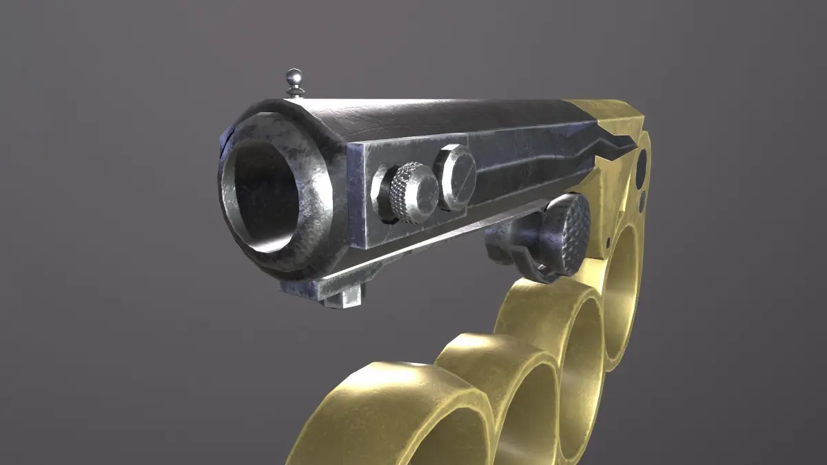 One of the early self-defense guns with a combination of brass knuckles, a small and finicky wavy-bladed dagger, and a single shot percussion pistol barrel.