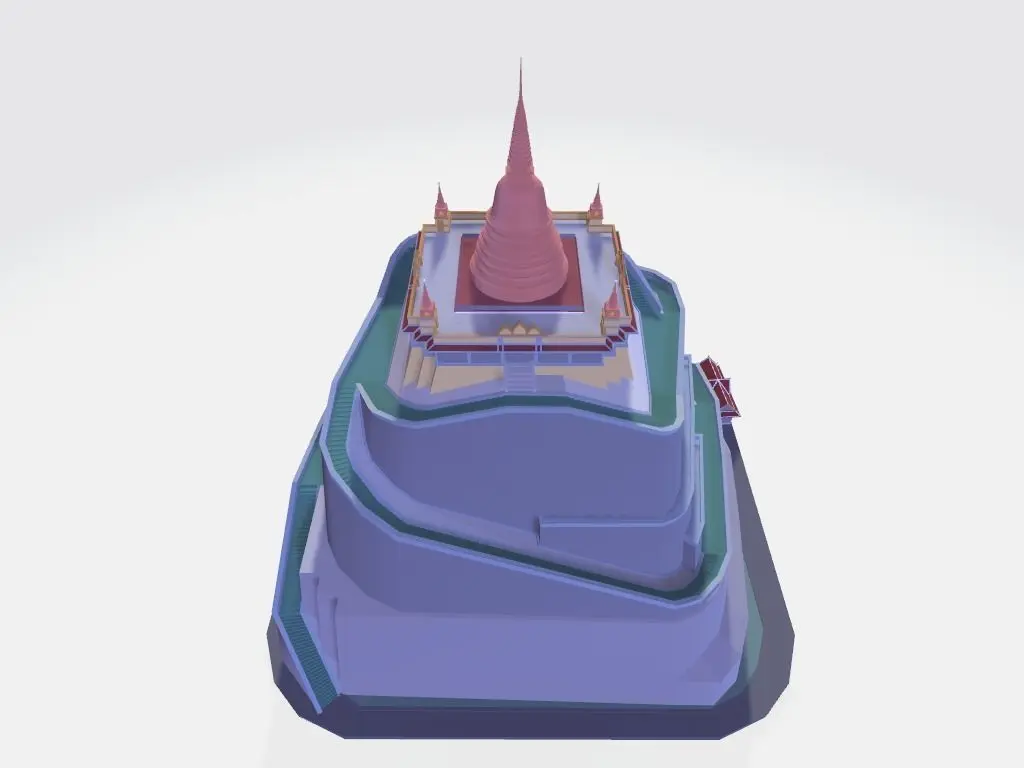 The 3D model of the Temple of the Golden Mount (Wat Saket) was created to represent one of Bangkok’s most iconic and historically significant temples. The project emphasizes the unique architectural composition of the temple, built on an artificial hill with the gleaming golden chedi as its central landmark — symbolizing spiritual elevation and serenity above the city.