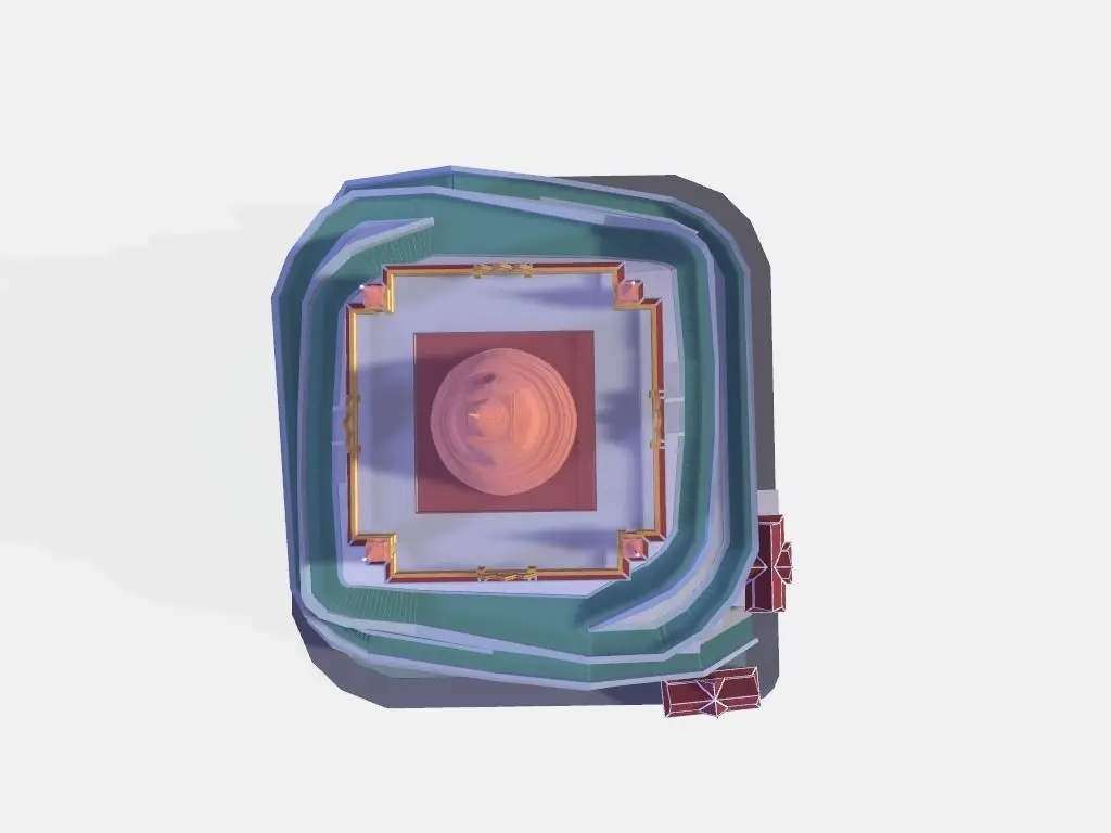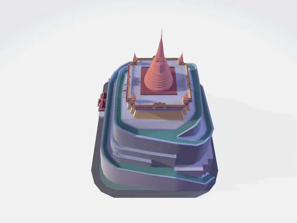 The modeling process began with architectural research and data collection, including photographs, aerial references, and topographic studies, to accurately capture the temple’s proportions and surroundings. The base terrain and structure were modeled using SketchUp (or specify: Blender / 3ds Max / Revit), starting from the sloped base of the mount up to the circular platform supporting the main chedi.