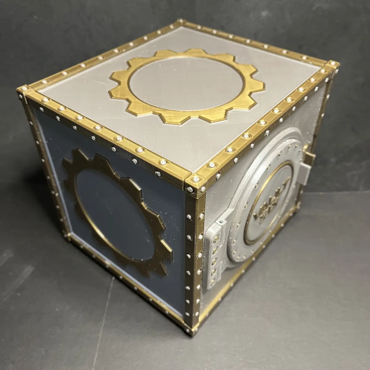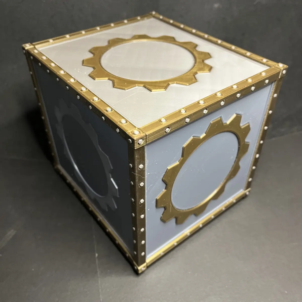 This is quite probably the most complicated and largest project I've taken on to date; a jewellery/trinket box with a magnetically-locked door. The hinged door has a cog which rotates into place, then when the gold tab is moved to the left, locking the cog in place so the door can't be opened. You can then even remove the locking tab and put it somewhere else and the door won't be able to unlocked. You'll need to source two 20mm x 10mm x 2mm neodymium magnets, one for the locking tab and one for the lock mechanism.