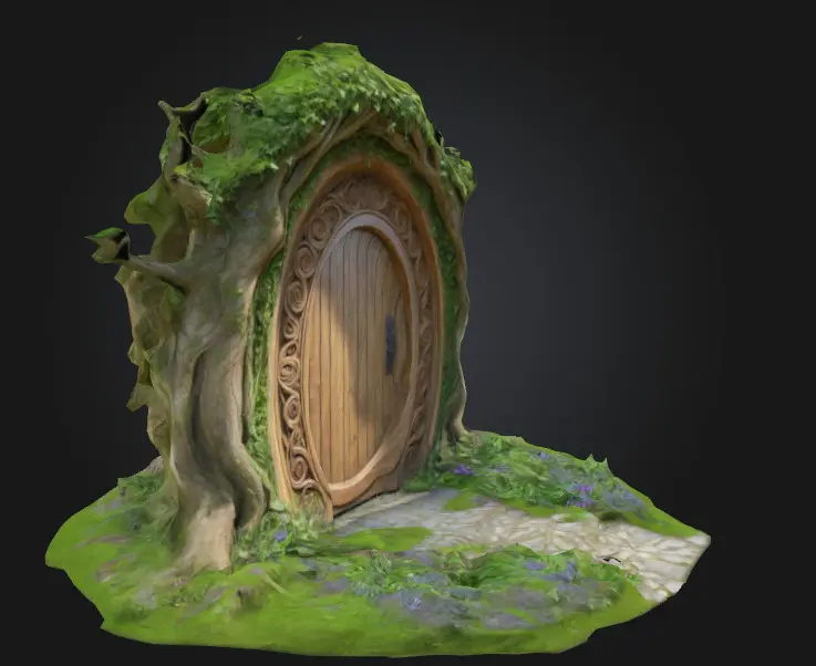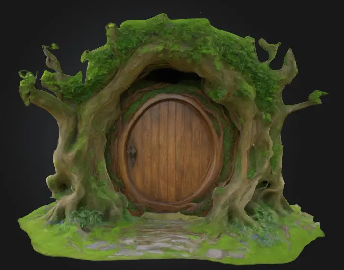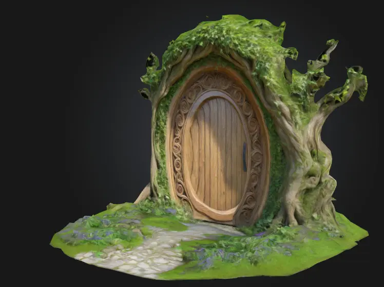 “The Verdant Gate” is a magical tree door carved into an ancient, moss-covered trunk, with intricate wood patterns and ivy accents. Perfect for fantasy RPGs, it can act as a portal to hidden realms, a mystical dungeon entrance, or a forest dwelling. Ideal for enchanted forest scenes or as a gateway to otherworldly adventures in games or films.