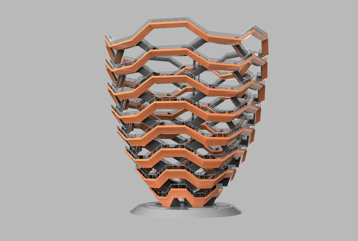 The elaborate honeycomb-like structure rises 16 stories and consists of 154 flights of stairs, 2,500 steps, and 80 landings that visitors would be able to climb. Designed by the British designer Thomas Heatherwick, Vessel is the main feature of the 5-acre (2.0 ha) Hudson Yards Public Square. It is expected to have a final cost of $200 million.