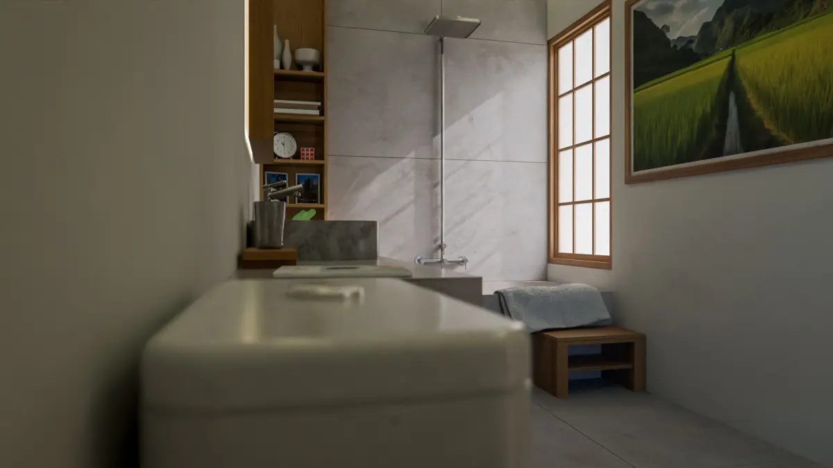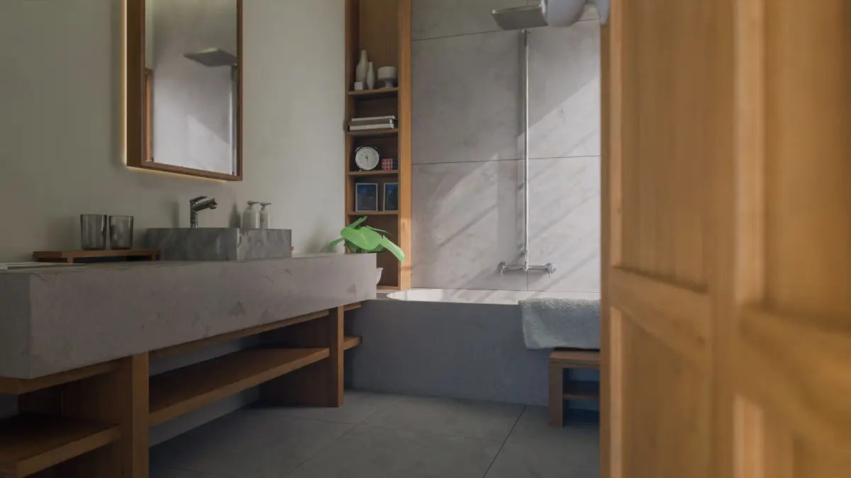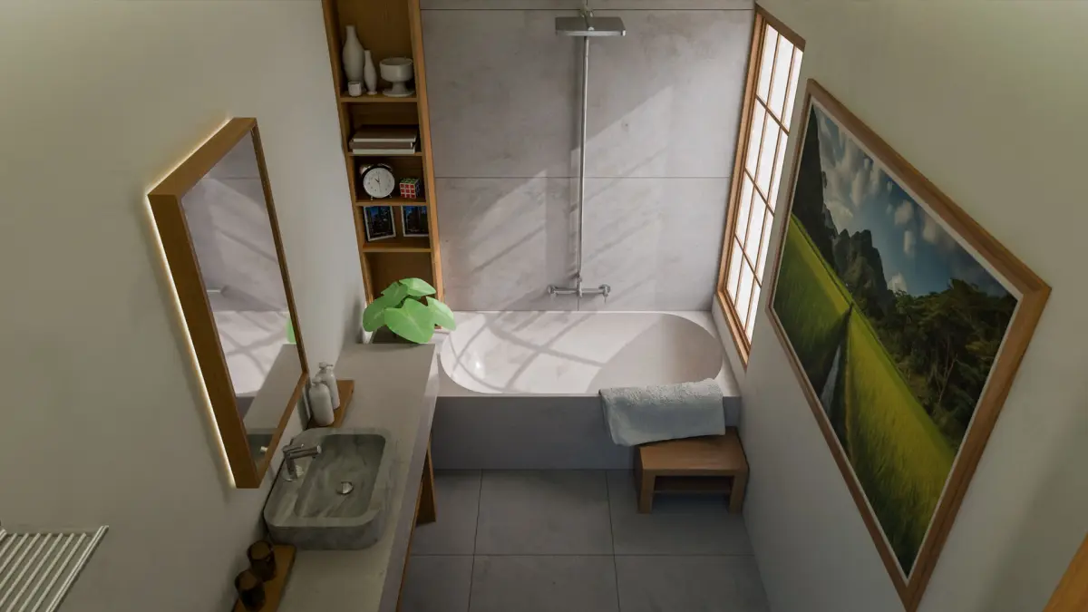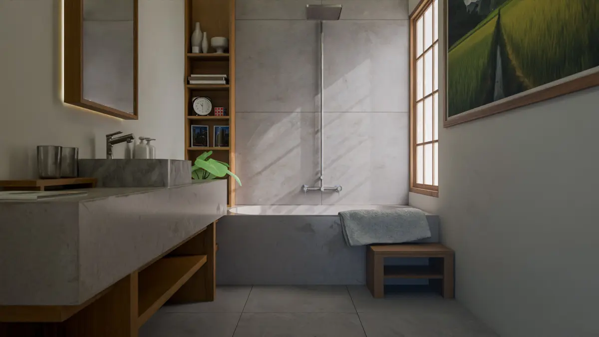 The warm minimalist bathroom with a large mirror and a window. The bathroom has a modern design with a grey tile floor and a grey sink.