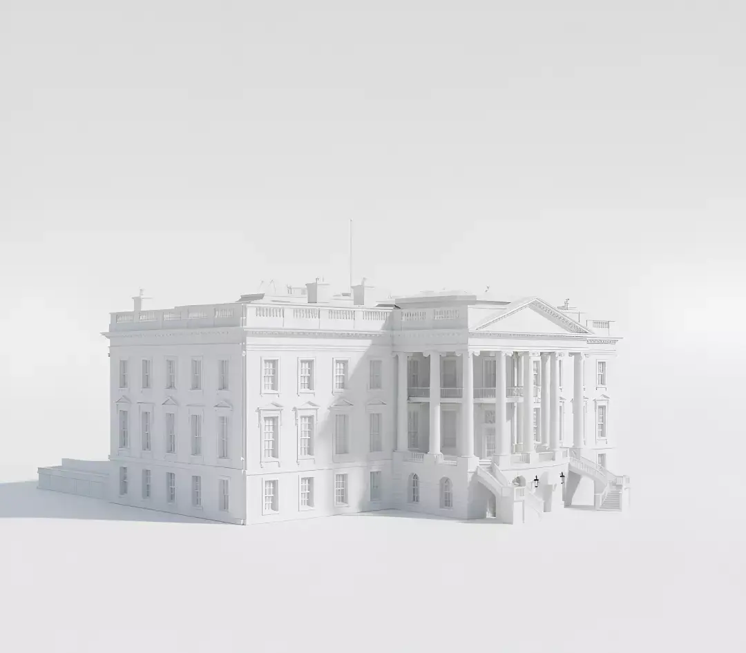Rendered in a simple white/clay style, the focus is on the intricate geometric details and classical neoclassical architecture, including the columns, pediment, balustrades, and the iconic sweeping staircases. The model captures the full structure of the Executive Residence with accurate proportions. This untextured presentation is ideal for demonstrating the model's geometry and topology before texturing, making it a valuable base asset for architectural visualizations, simulations, film backgrounds, or interactive virtual reality tours of the famous Washington D.C. landmark.