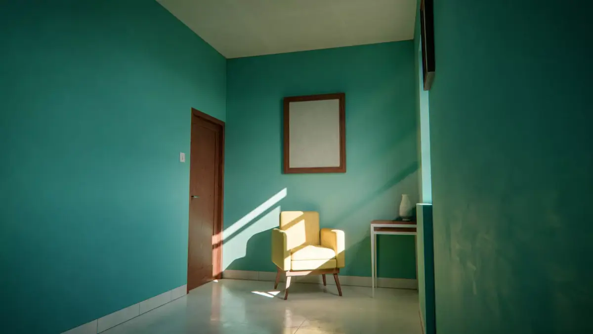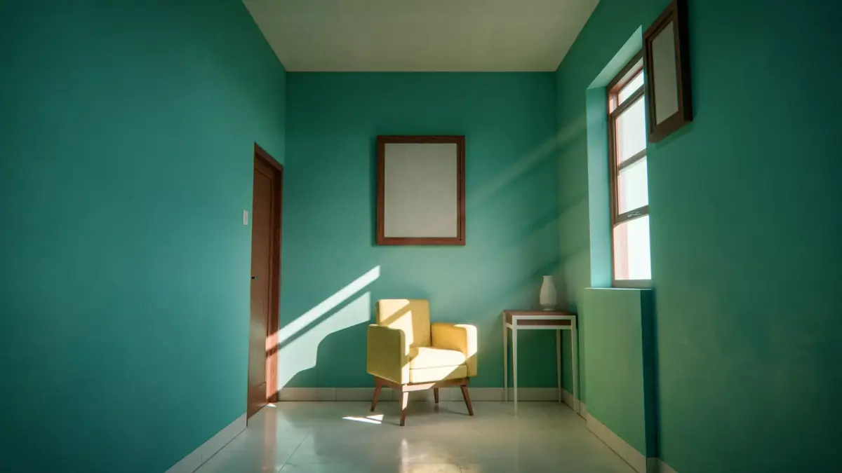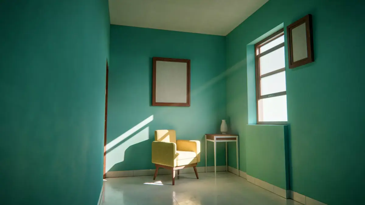 Sunny interior 3D render with yellow armchair and teal walls. Minimalist room with window shadows, empty frame, and side table. Colorful home design concept with strong natural lighting.