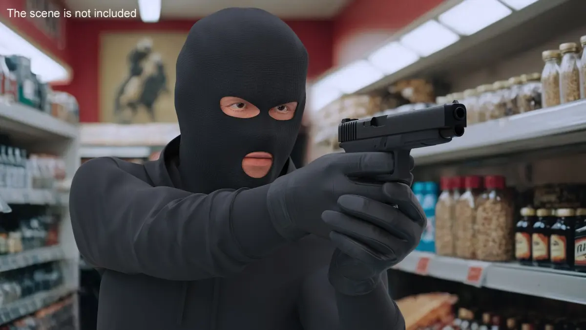 Thief Character Wearing Mask Rigged is a three-dimensional model of thief or criminal character with crowbar and gun, featuring a fully black outfit, a black mask, and a balaclava cap, embodying the archetypal look of a stealthy intruder.