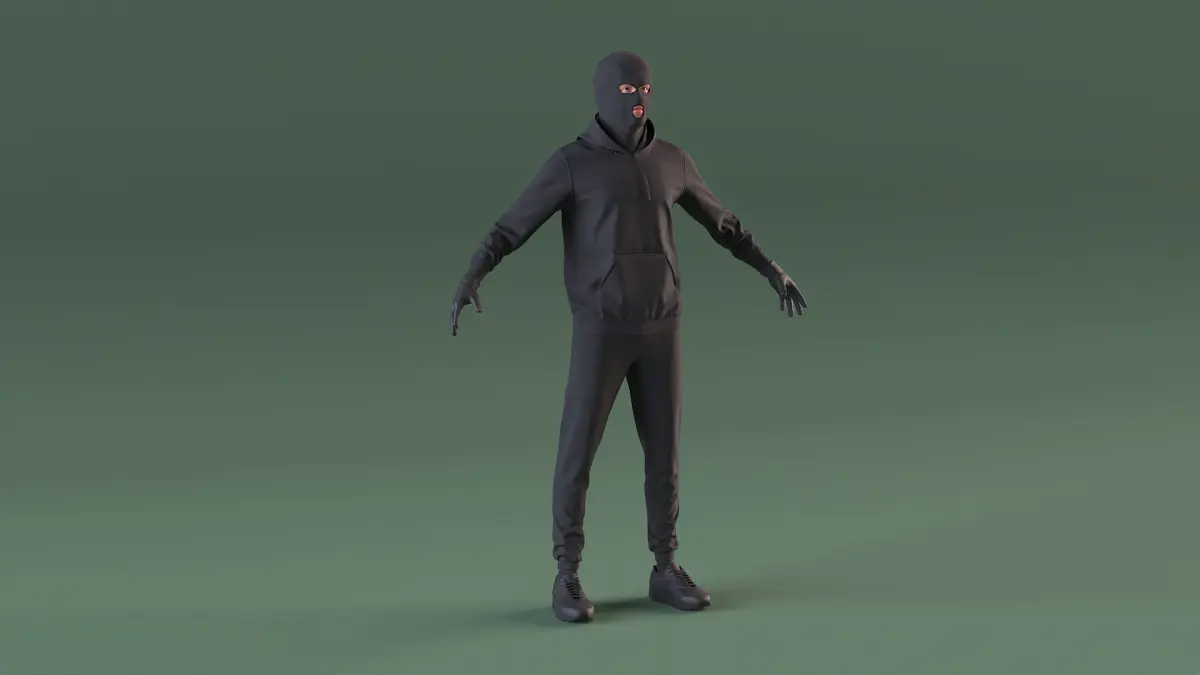 Key features include a detailed balaclava-style mask, gloves for stealth, and a crowbar in hand, emphasizing the character’s readiness for action. The model’s pose and expression convey a sense of stealth and determination, making it ideal for storytelling or action-packed scenes. The model showcases a realistic human male thief dressed in dark, form-fitting attire for concealment and agility.
