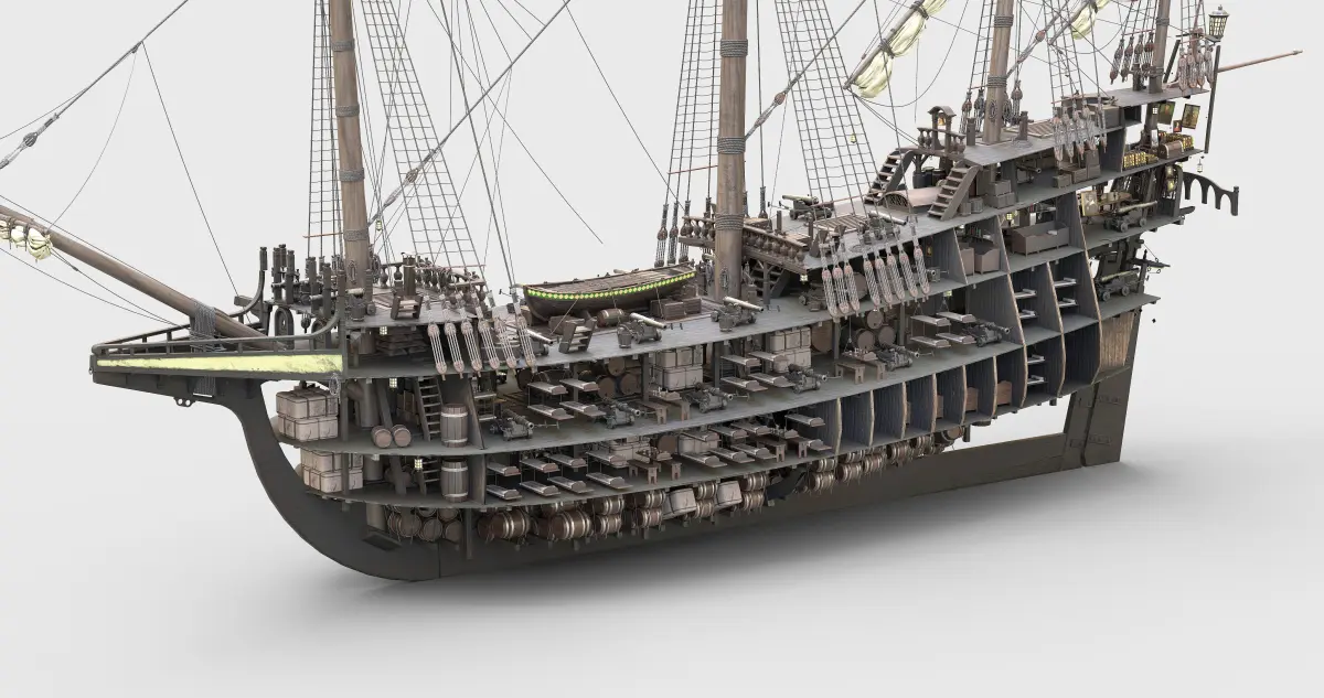 Fully detailed interior.All decks completed.Complete arrangement of furniture and cargo.Detailed interiorsMore than 50 unique interior objects.More than 100 unique ship objects and structures.Possibility of choice: unfolded sails, assembled sails.The model based on sailing ship GalleonHighly detailed and realisticAll parts have unwrapped UvsPreview rendered with V-Ray 3.20.03 Maya DefaultScene with all Vray settings Maya Defaultpolygons - 2967467vertices - 3095146Real world scale105 textures with resolution from 4KSea water material is includedNo Third-party plug-ins usedTextures Formats:All textures are included in the .zip file.
