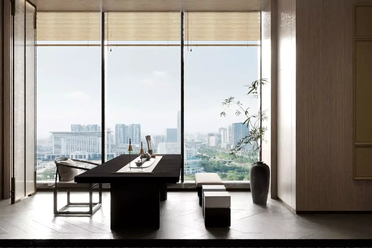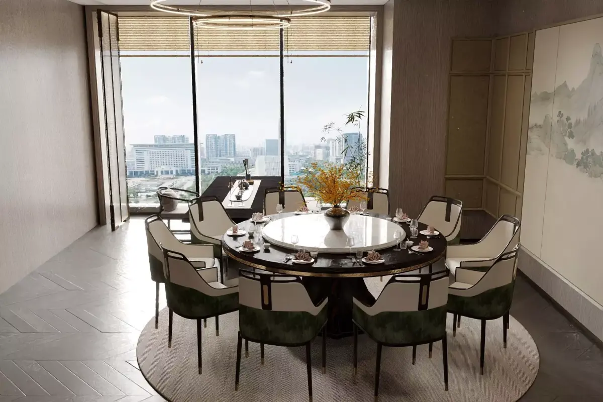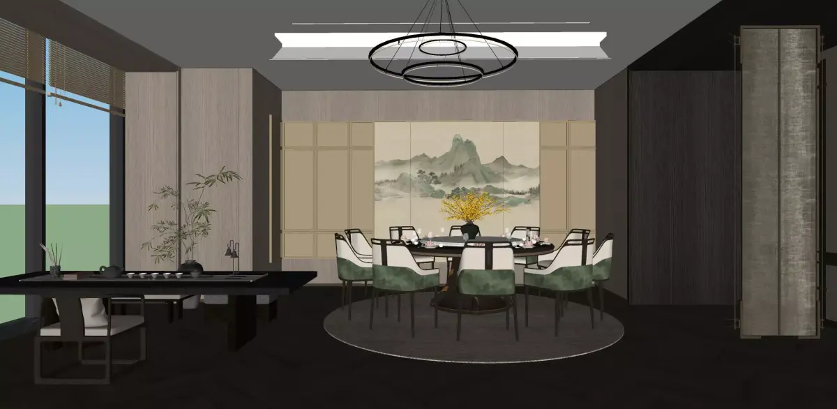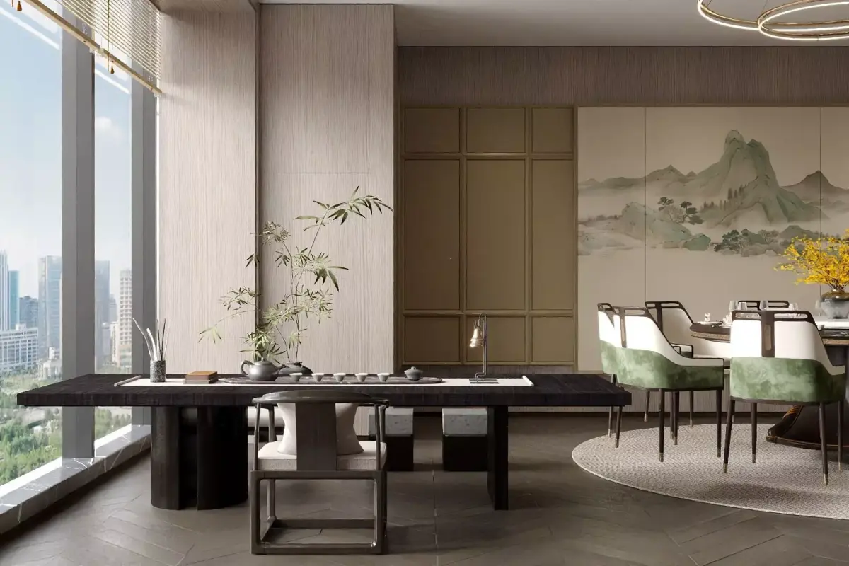 This Chinese - style restaurant private room takes landscape paintings as the background, matched with elegant tables, chairs and tea sets, and green plants are dotted around, creating a quiet and far - reaching atmosphere. Through the large window, the urban scenery comes into view, and tradition and modernity blend, fully showing the unique charm of Chinese aesthetics.