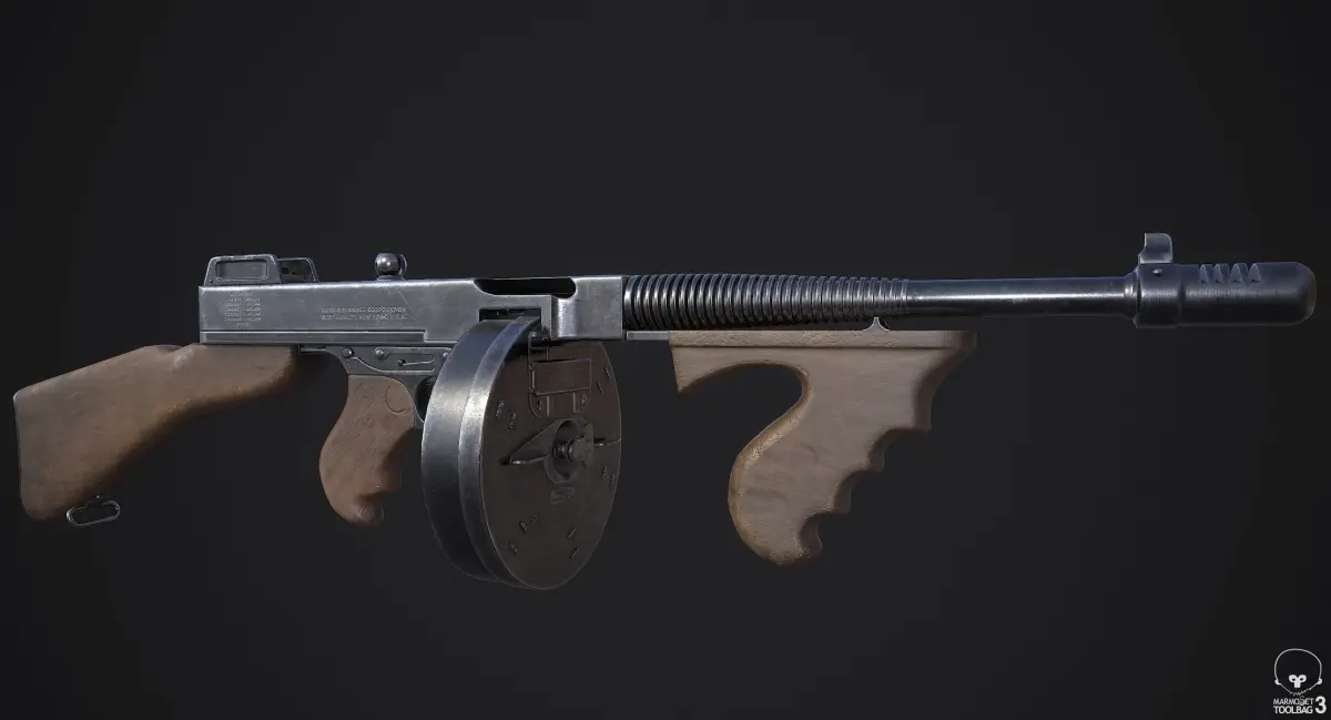 This firearm comes with 50 round drum magazine, 30 round box magazine, and .45 ACP cartridge. The bolt, safety, fire selector, magazine catch and sights can be articulated.