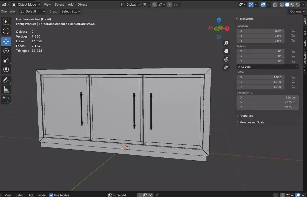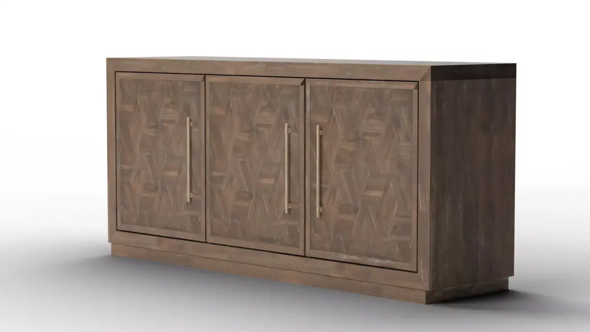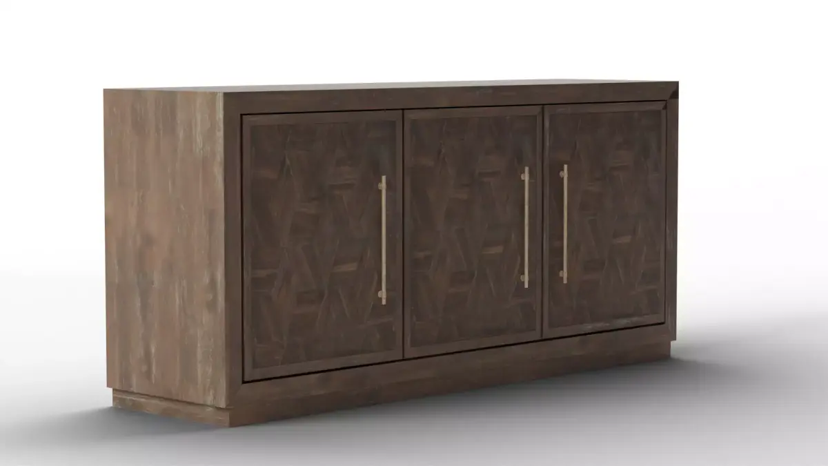 Bring a sophisticated architectural anchor to your dining and living room renders with the Tumbler Three-Door Credenza. This high-fidelity 3D model is defined by its substantial profile and the rich, multi-tonal depth of its Tumbler Dark Brown finish. Featuring a minimalist handle-free design and a clean plinth base, this credenza serves as a masterclass in understated luxury. It is an essential asset for high-end residential archviz, executive office suites, or gallery-inspired interiors where storage needs to be both massive and elegant.