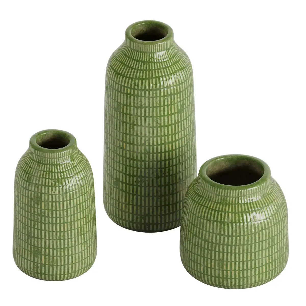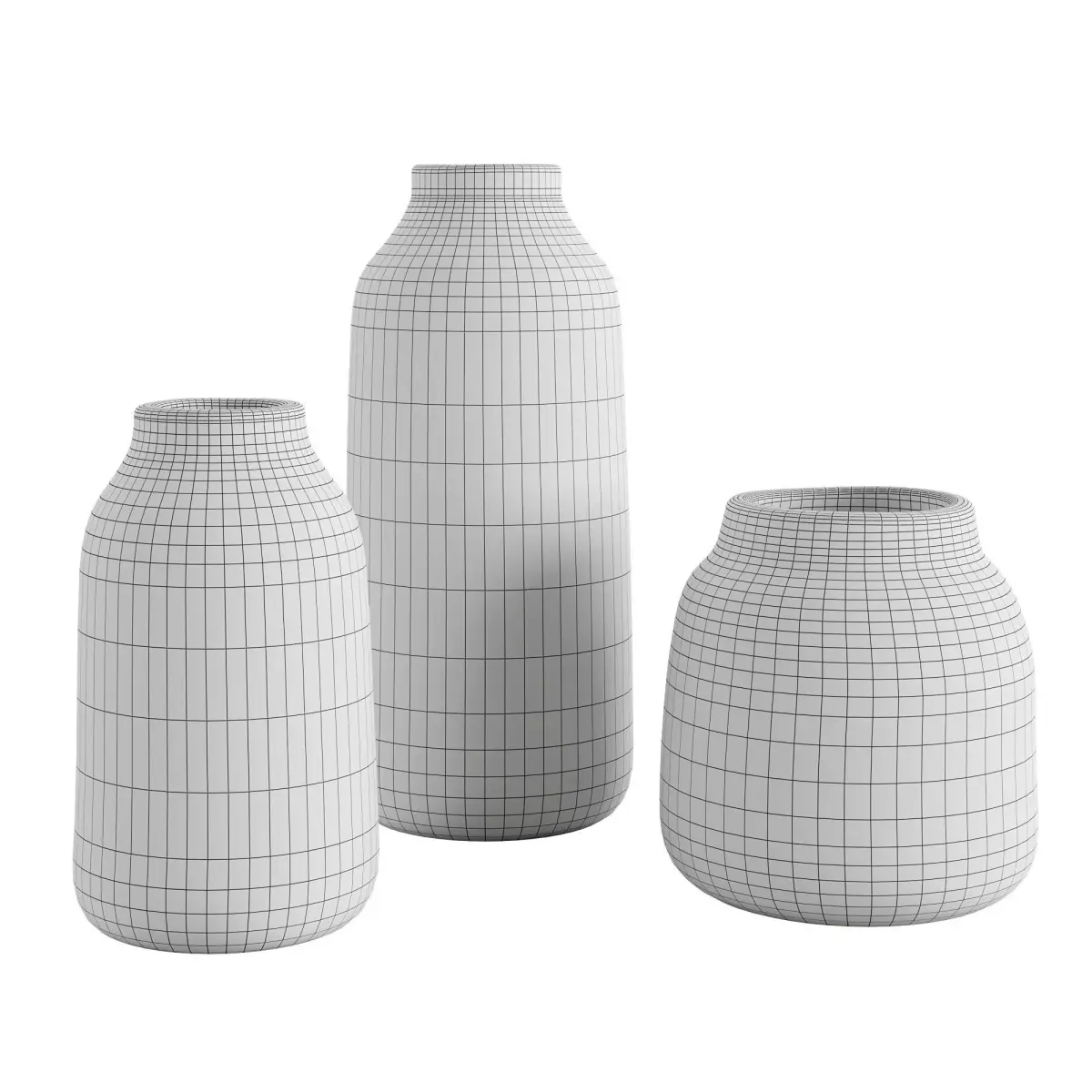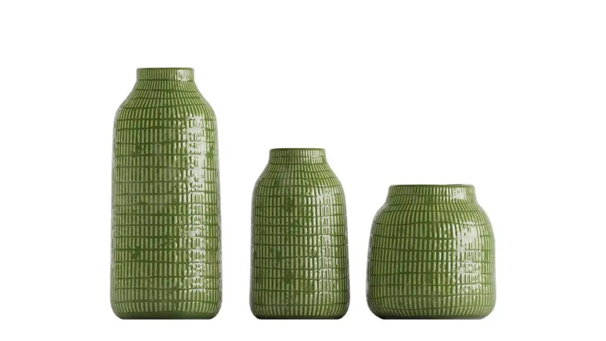 Three Green vasesThese three handcrafted, glazed green vases, featuring embossed patterns and vibrant colors, would be a delightful addition to any interior space.Type: modelFormat: 3Ds Max 2021Export: FBX, OBJ, 3DSRender: Corona (10,)Polys: 12528Verts: 12534Matclasses: _CoronaPhysicalMtlUnits: CentimetersDimension: 44.7 x 34.17 x 34.46