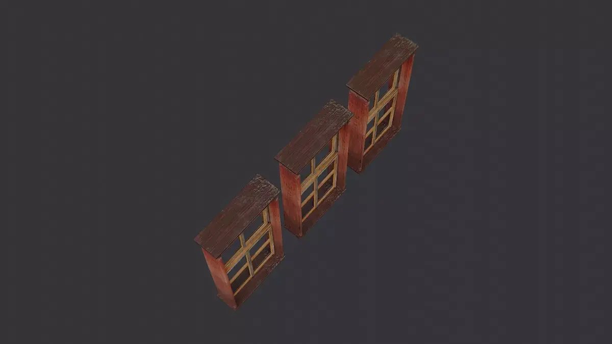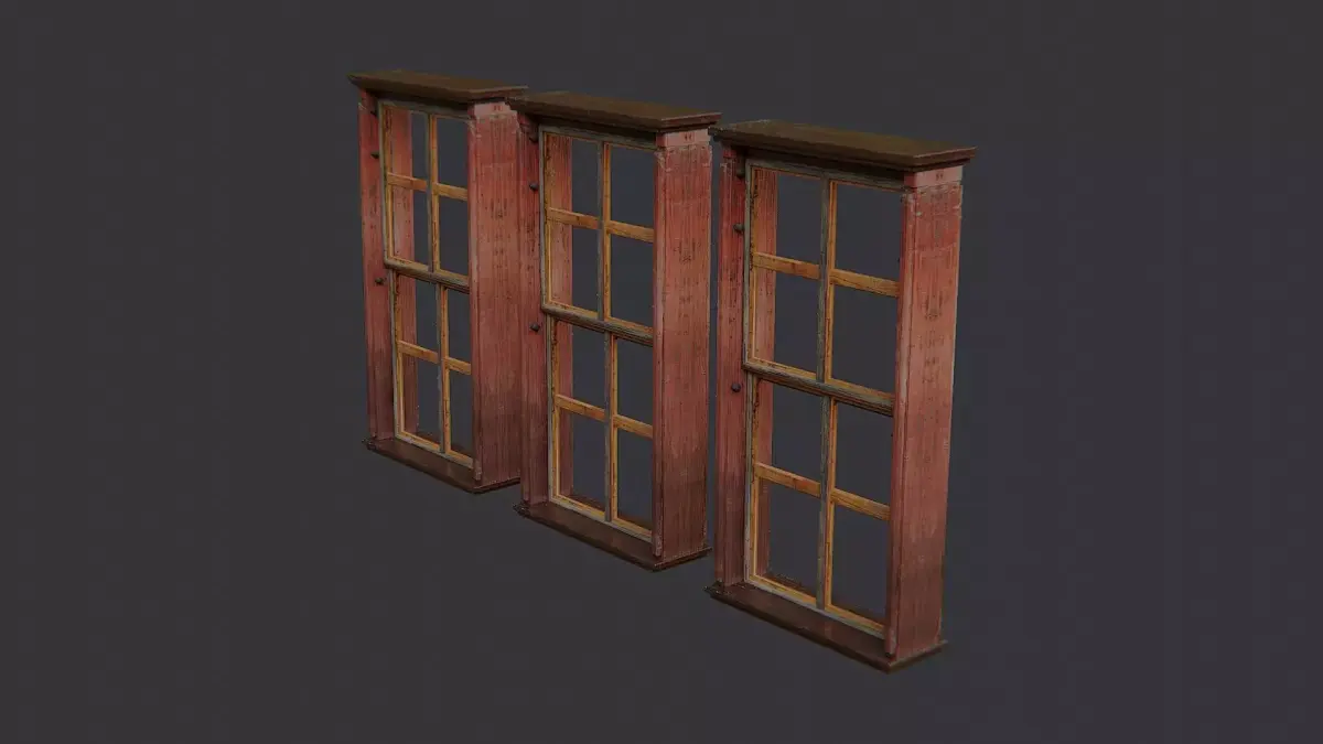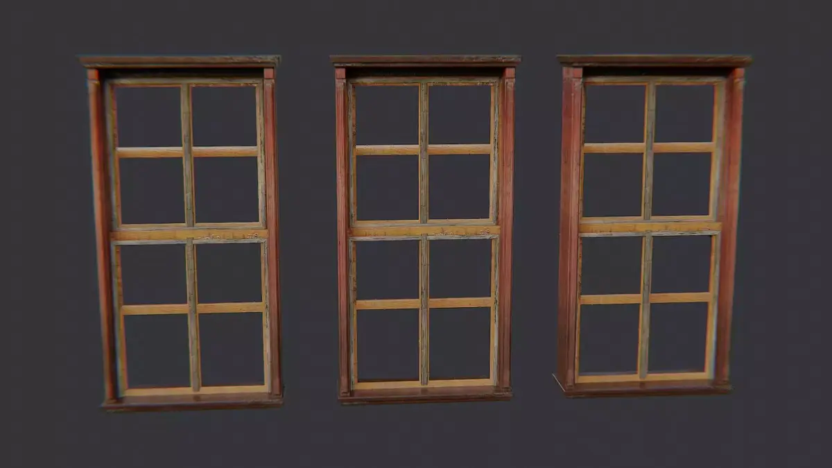 Three-panel ornate wood window adds timeless charm to architectural scenes. Crafted from rich wood with carved detailing and slender mullions, it offers warm natural textures and a classic silhouette. Rusted metal hardware provides authentic weathered character, ideal for vintage interiors, period reconstructions, or high-end visuals. Suitable for interior and exterior renders and historical styling projects.